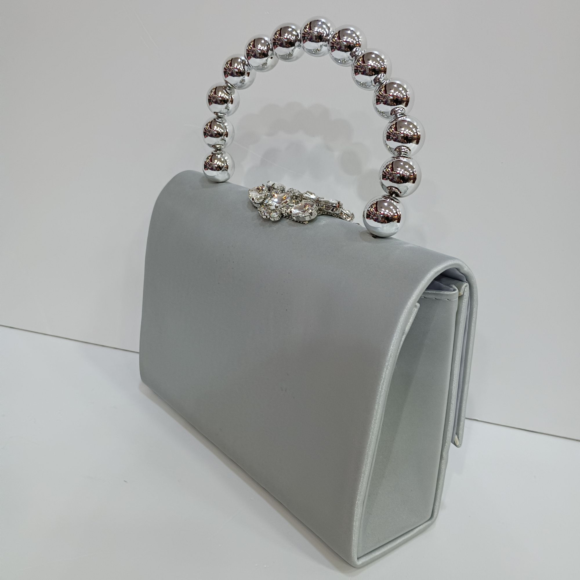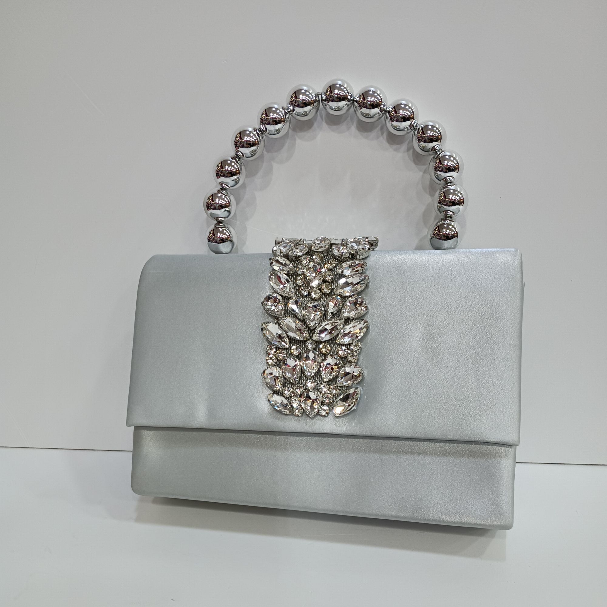 Bolso de asa de boda con bolas plateadas y cadena plata en el interior . Solapa con adorno de brillantes ideal para eventos.