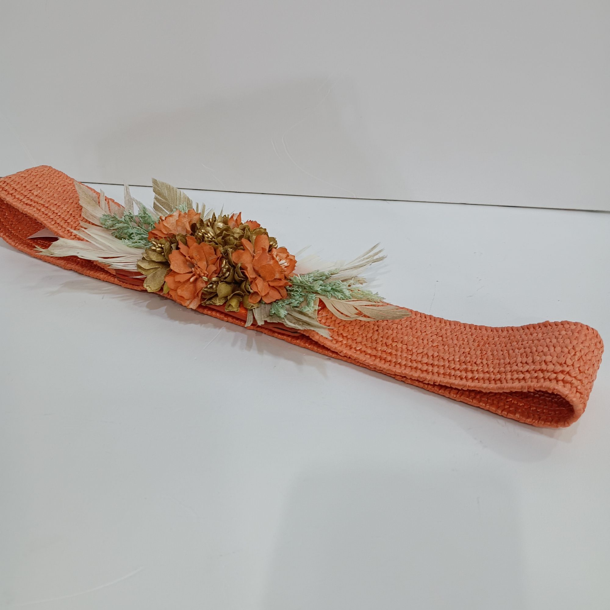 Cinturon de fiesta elastico de paja con cierre en la parte delantera .Flores y plumas en el flontal.