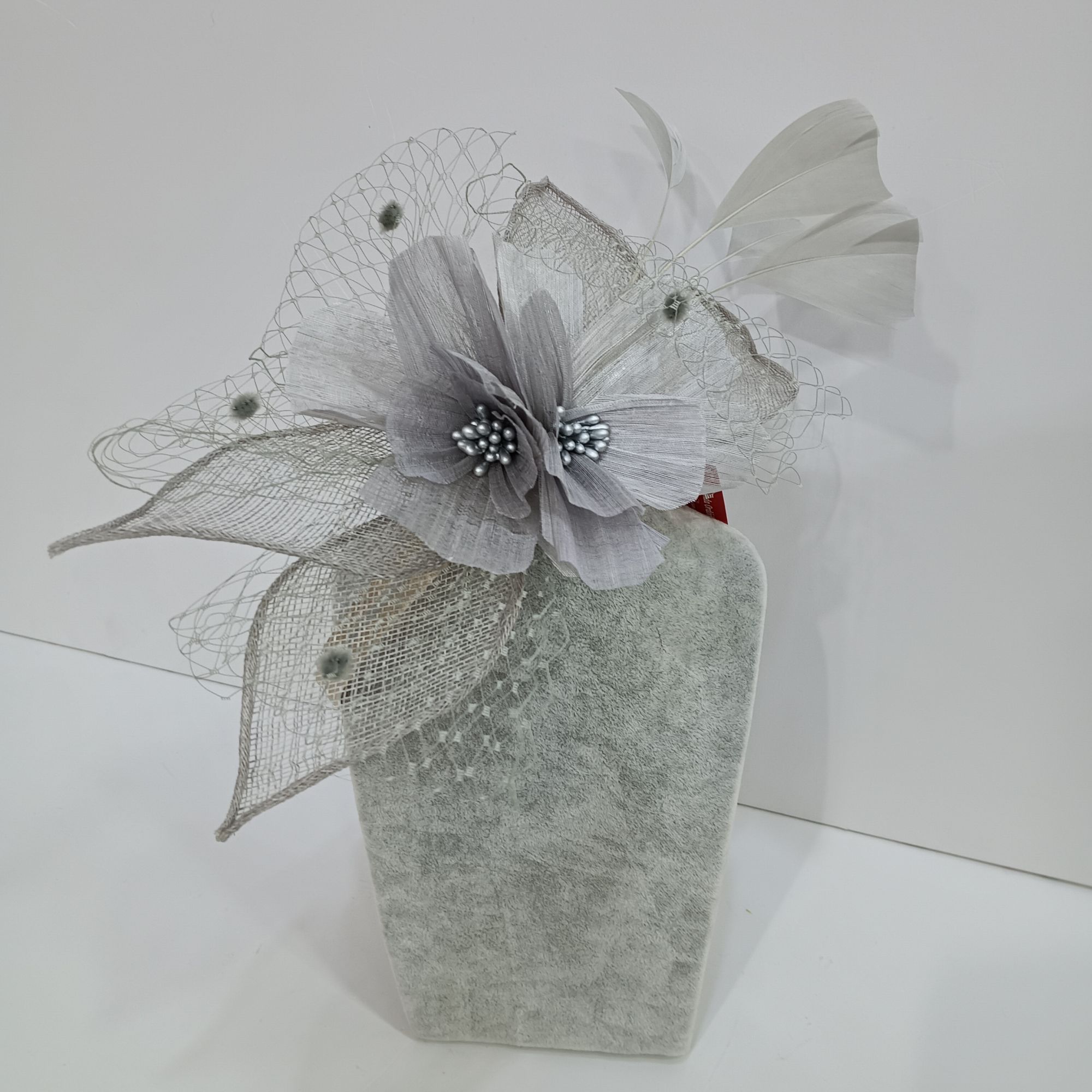 Diadema en metal dos flores en el central y plumas . Hojas de rejilla en la parte exterior , rodeàndola con `tul resultando un tocado muy sofisticado.
