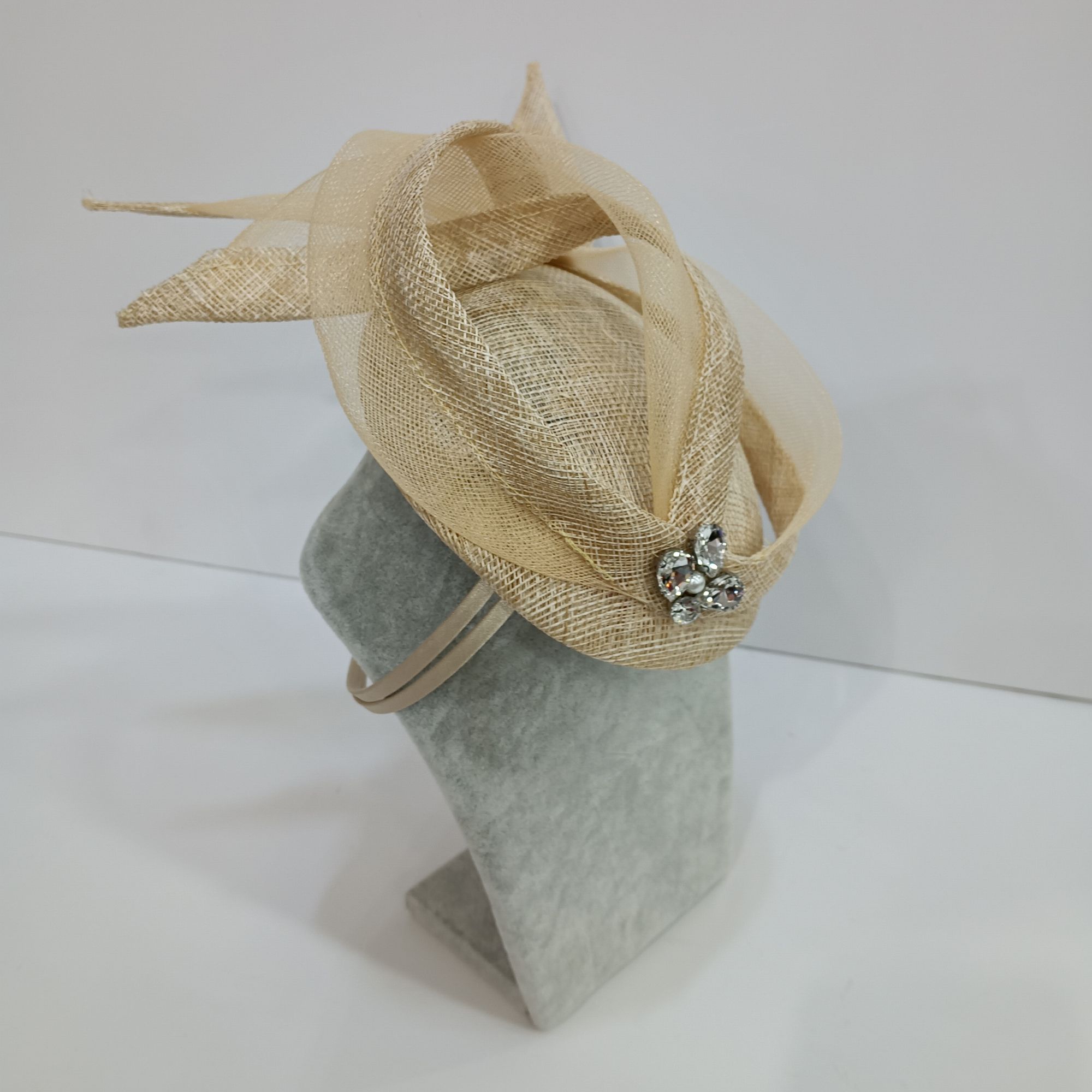 Tocado en rafia color beige con diadema y brillante en el centro.