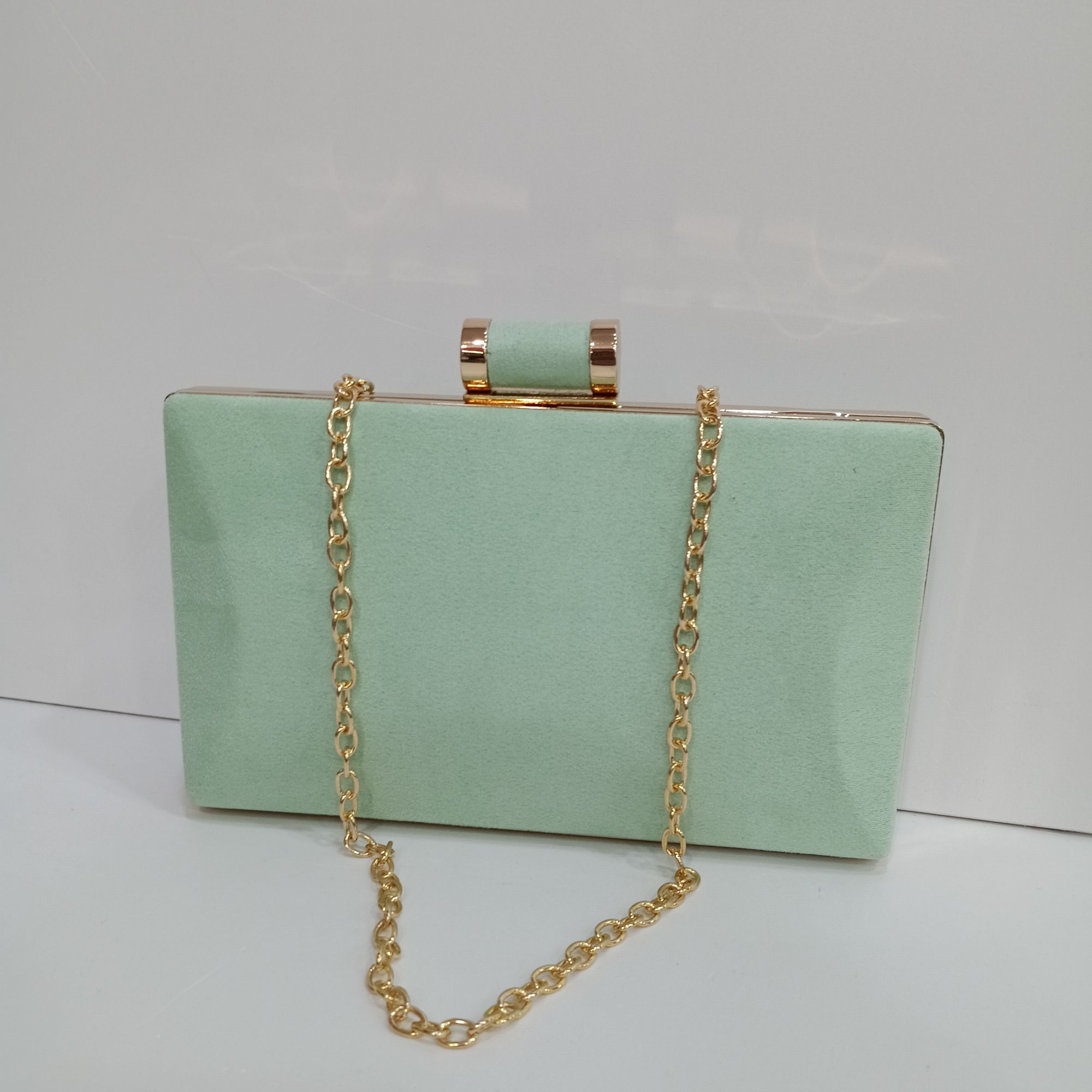 Bolso de antelina por los dos lados con broche y cadena de hombro en el interior .