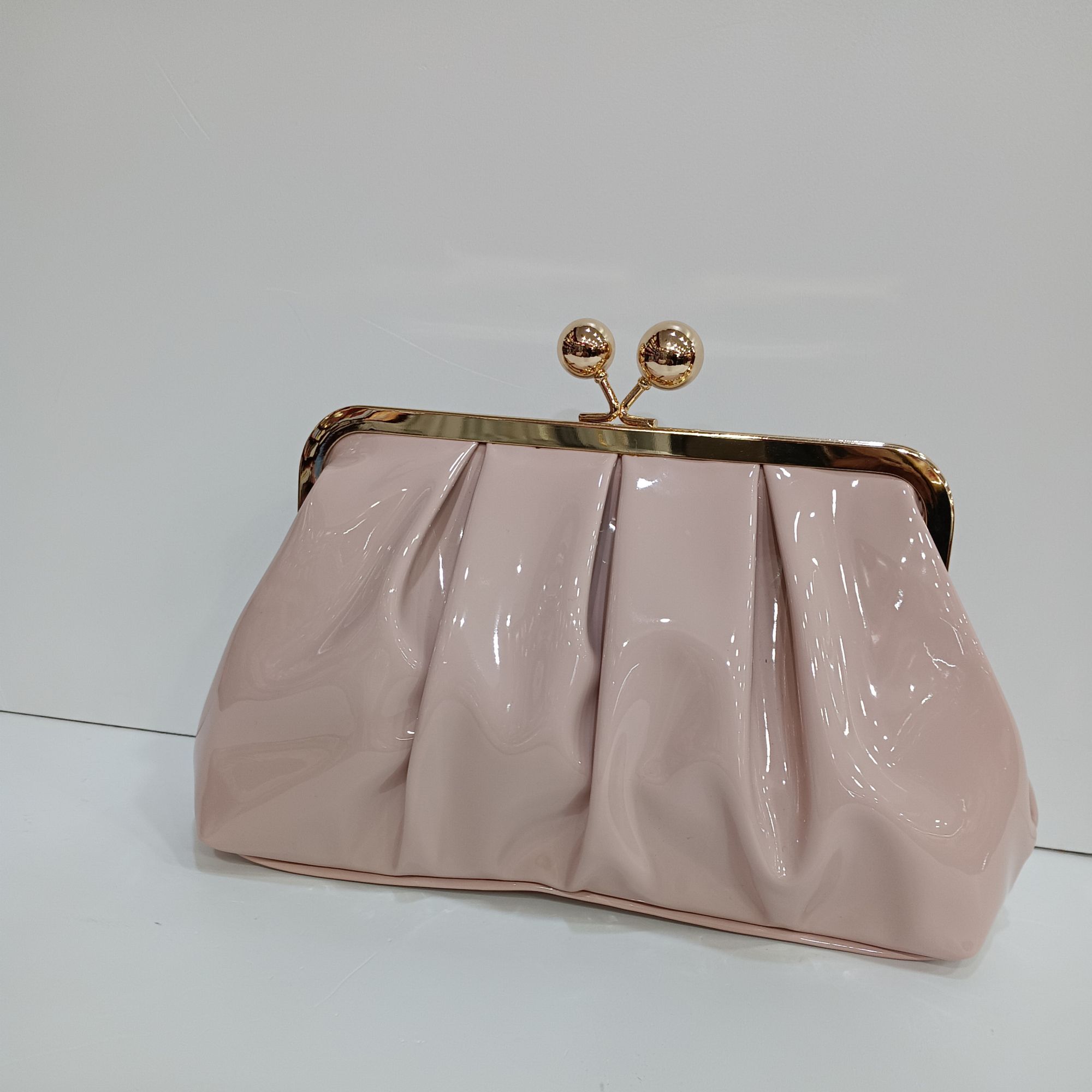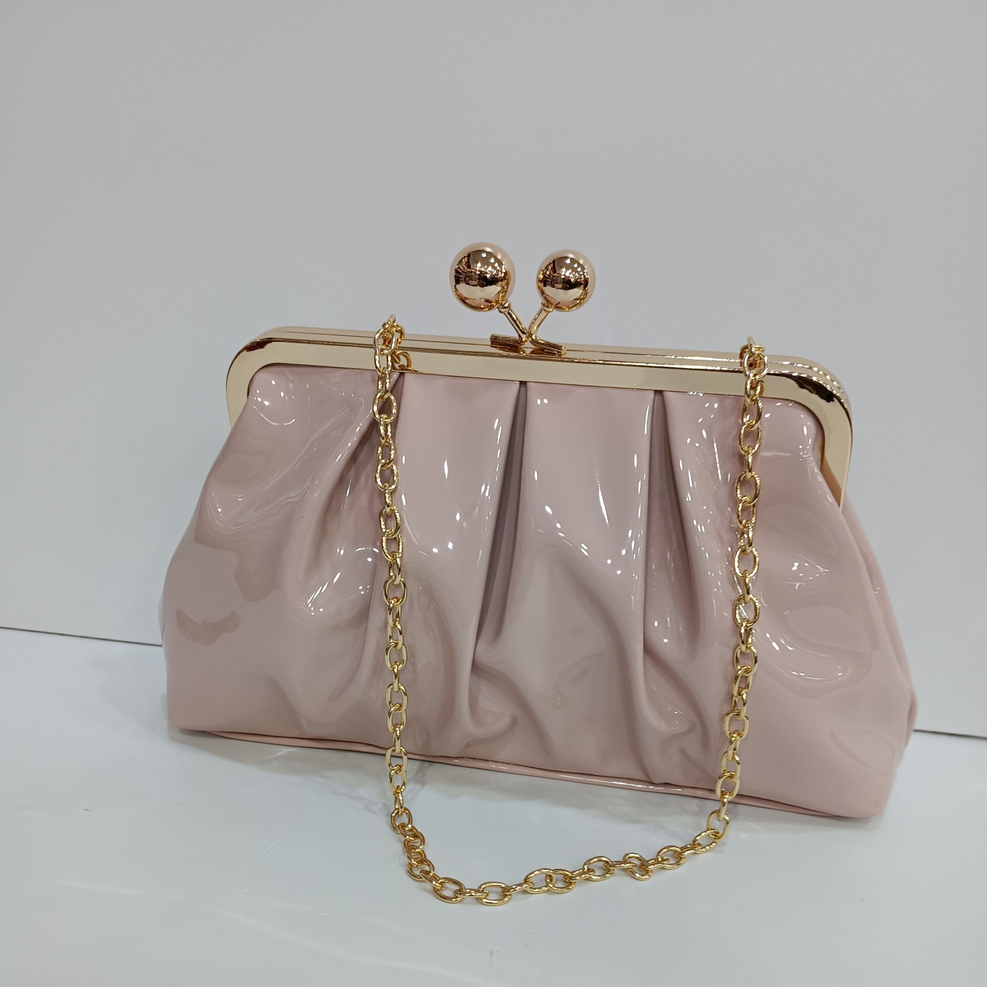 Bolso charol con plieges en los dos lados , cierre de boquilla con dos bolas , gran capacidad. Cadena larga para el hombro en el interior.
