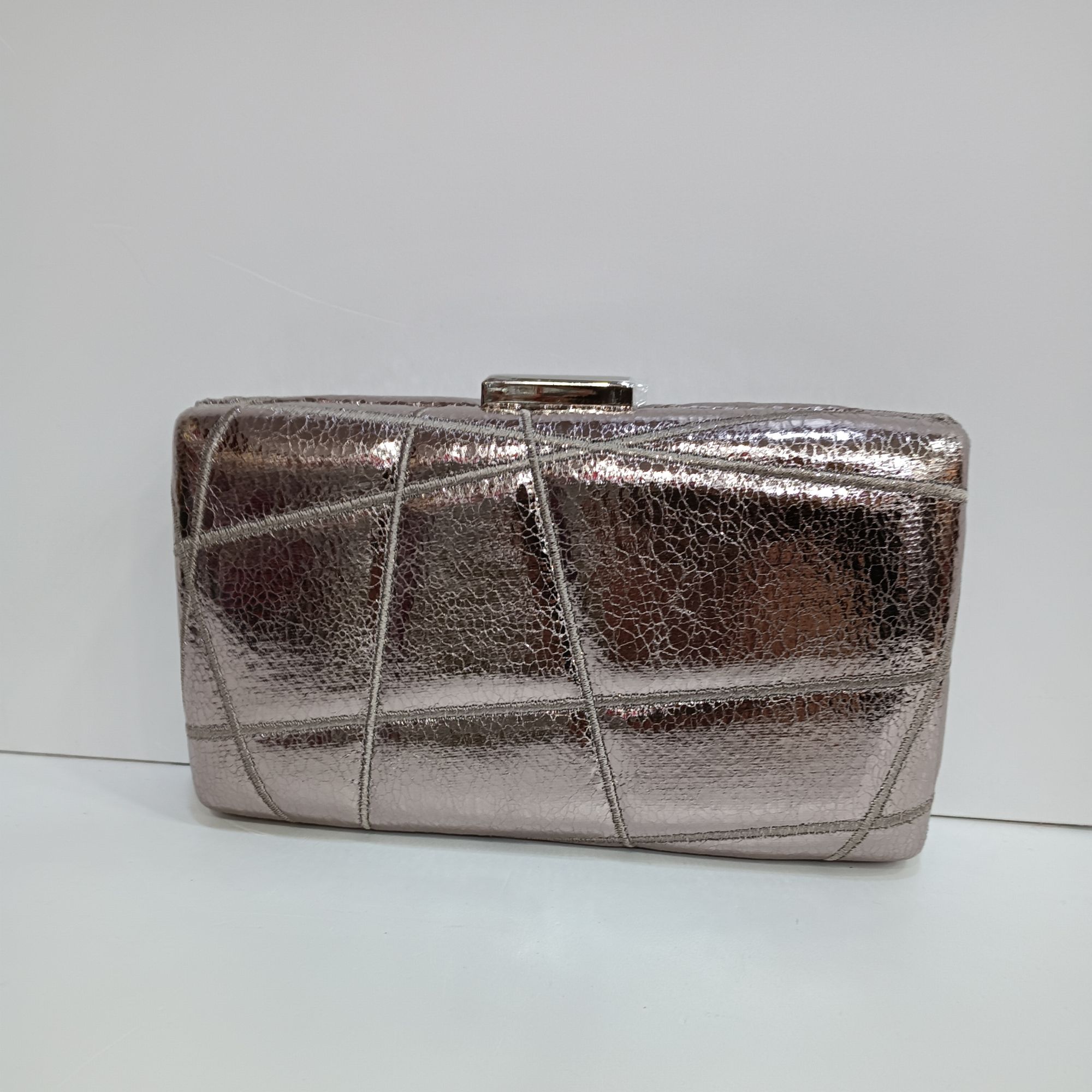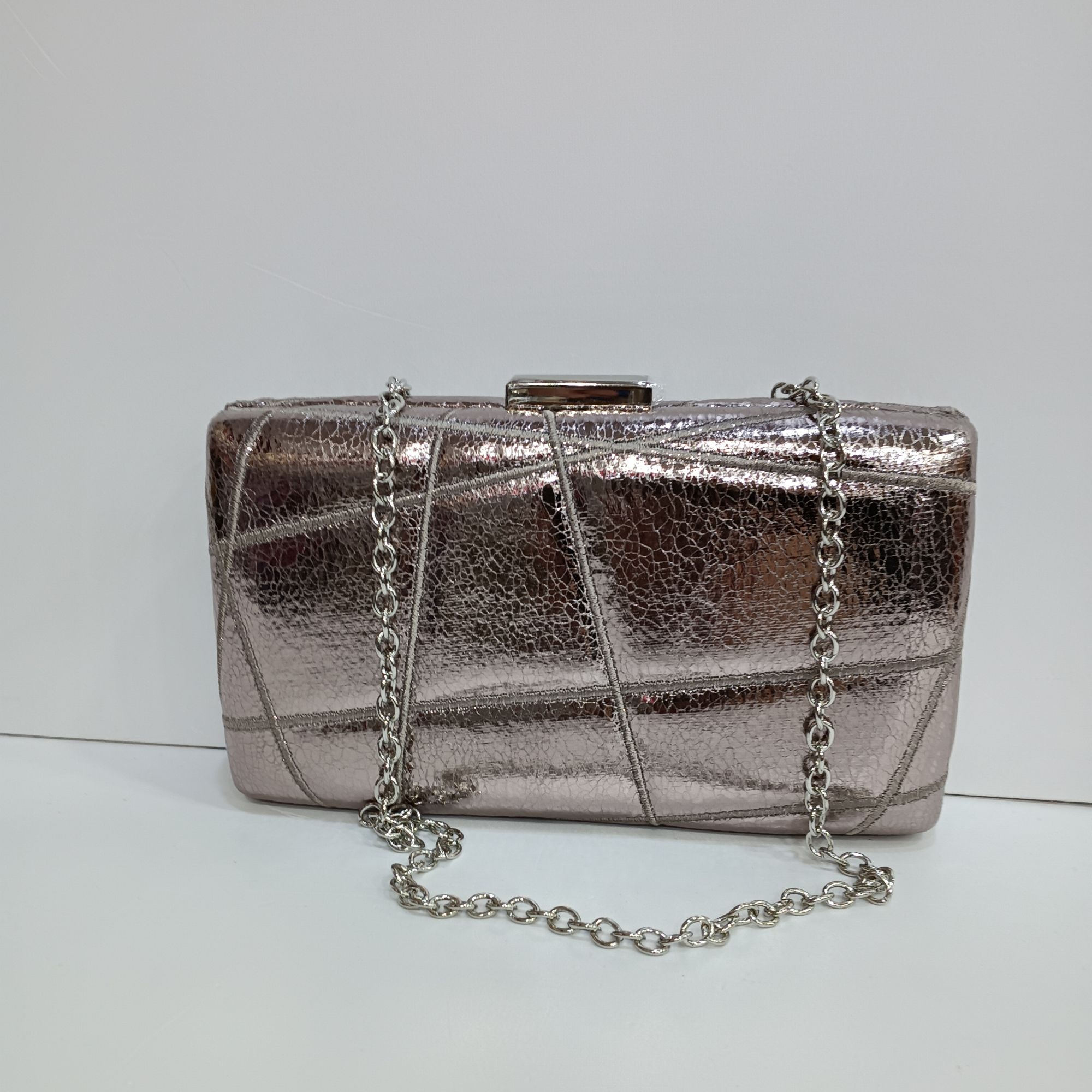 Bolso de boda con piel de serpiente con figuras en trapecio. Cadena para colgar en el hombro larga en el interior.