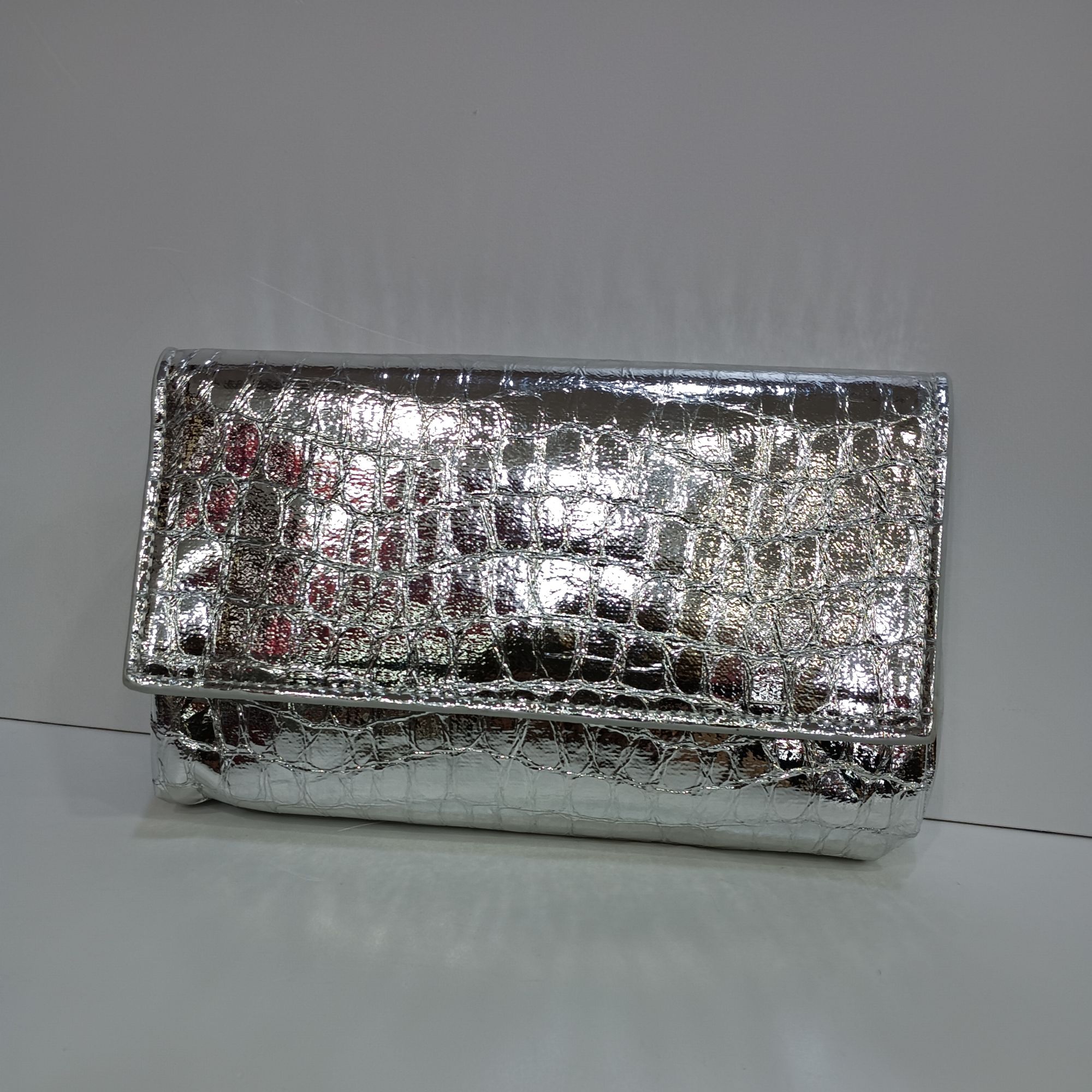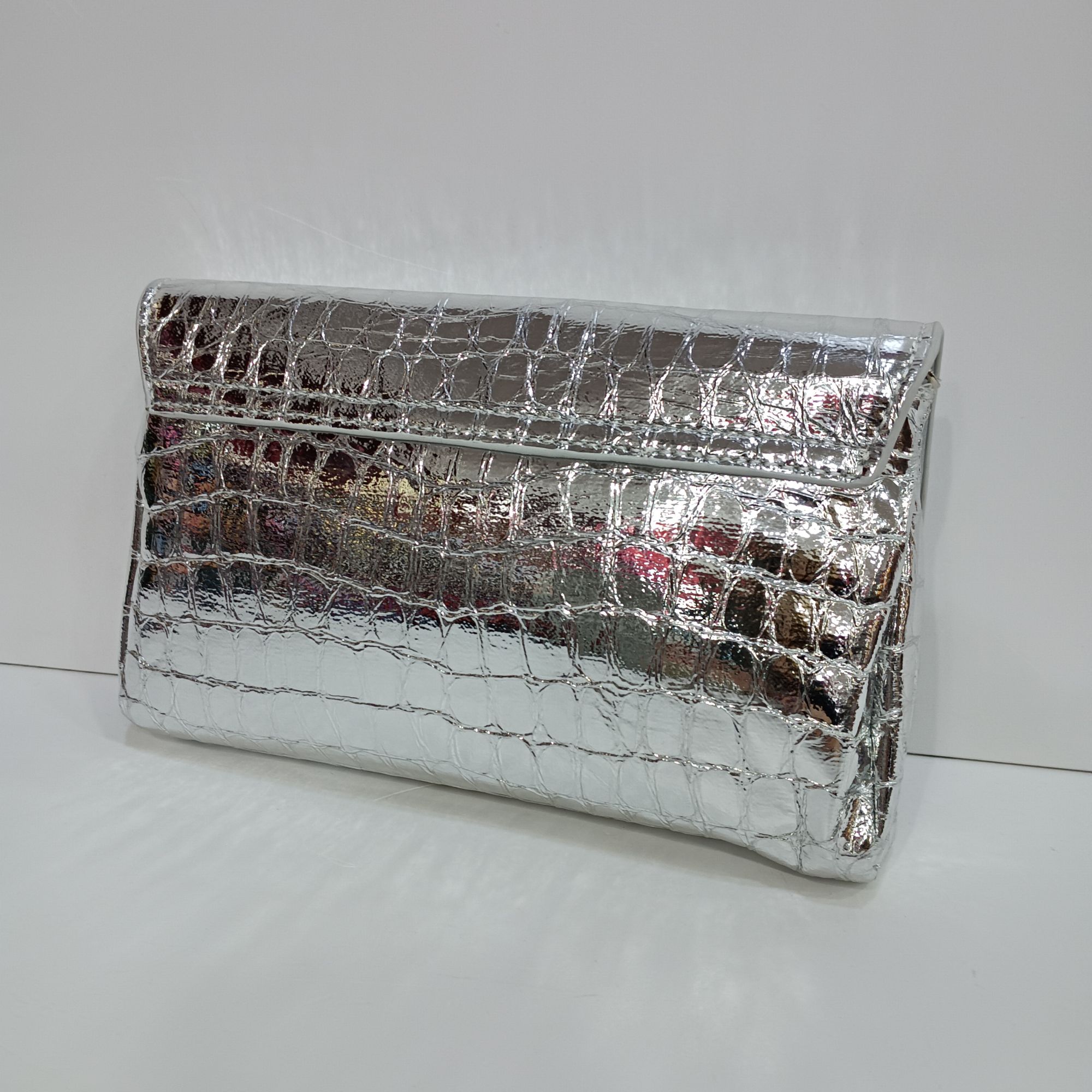 Bolso plata de sobre con solapa tipo coco y cadena plata larga en el interior. Gran capacidad para meter todo todo lo implescindible.