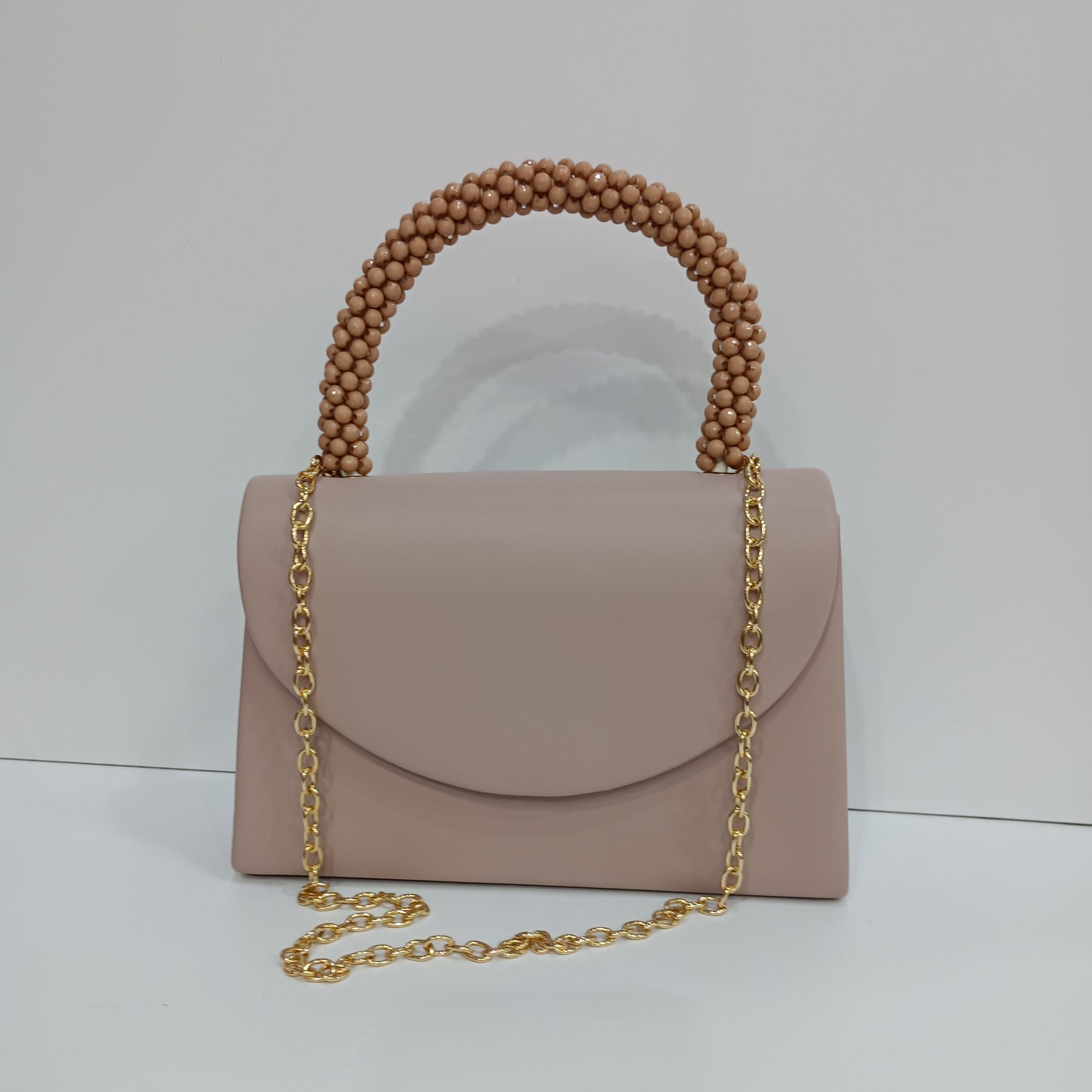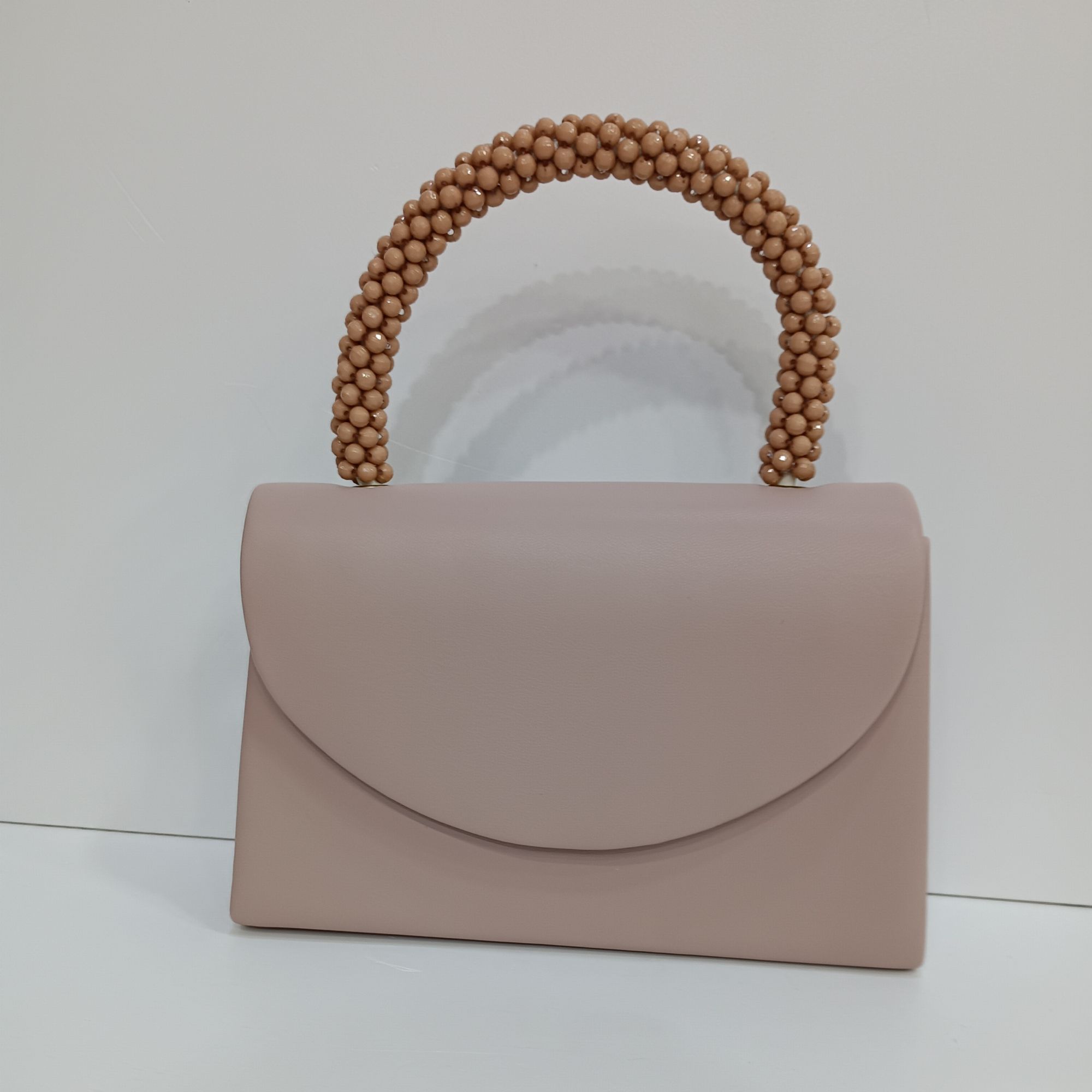Bolso rosa con solapa y asa con bolitas de color camel . Cadena dorada larga para poner en el hombro en el interior.