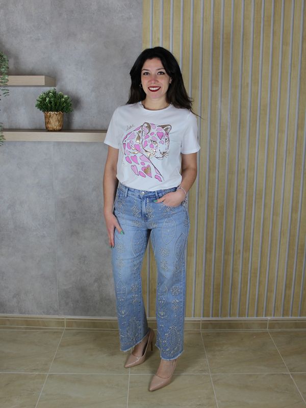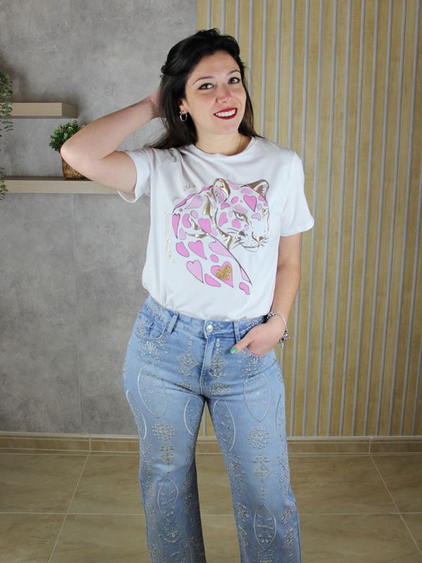 Camiseta básica de algodón con cuello redondo, manga corta y estampado de leopardo en tonos rosa y dorado.
