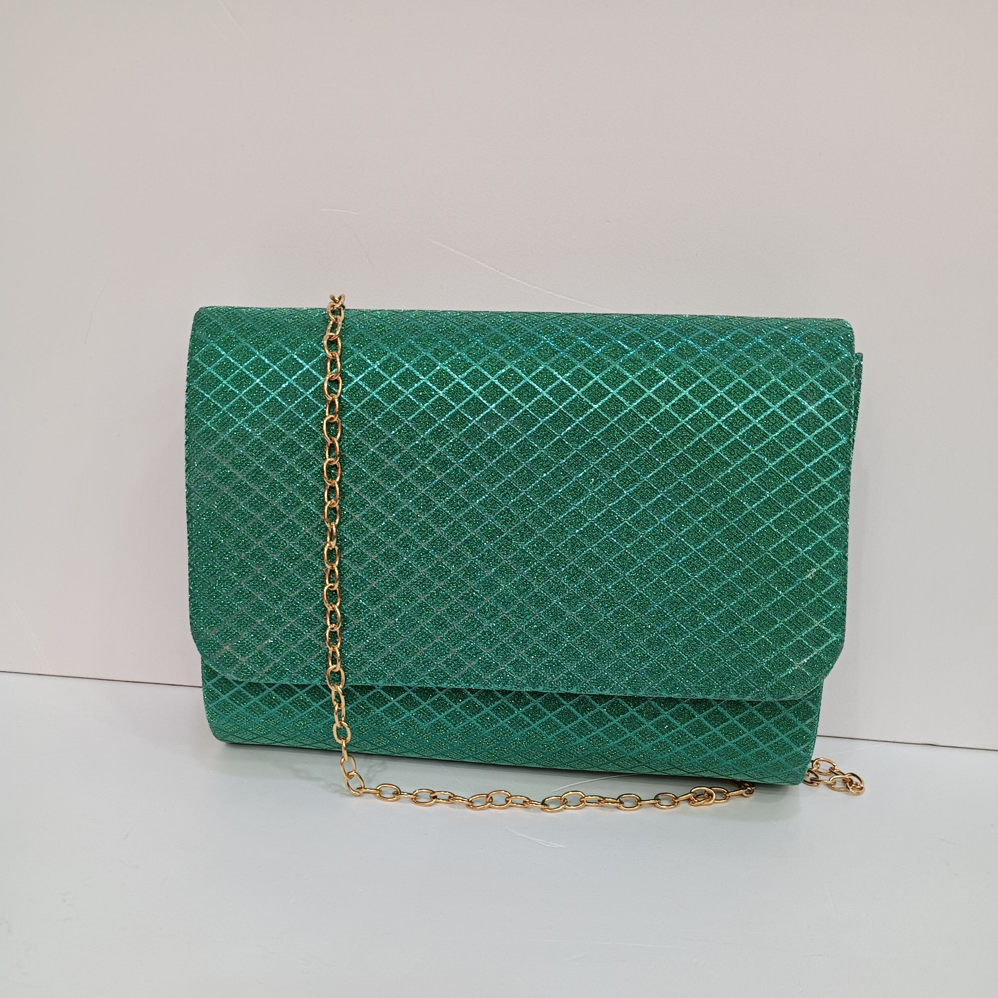 Bolso verde de boda con solapa en tela brillante, cadena dorada en el interior para hombro.