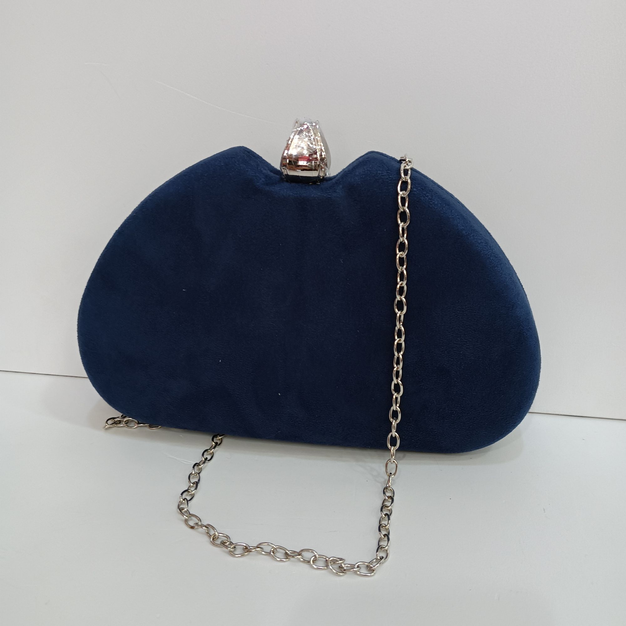 Bolso azul marino de antelina con broche en plata y cadena larga para el hombro en plata.
