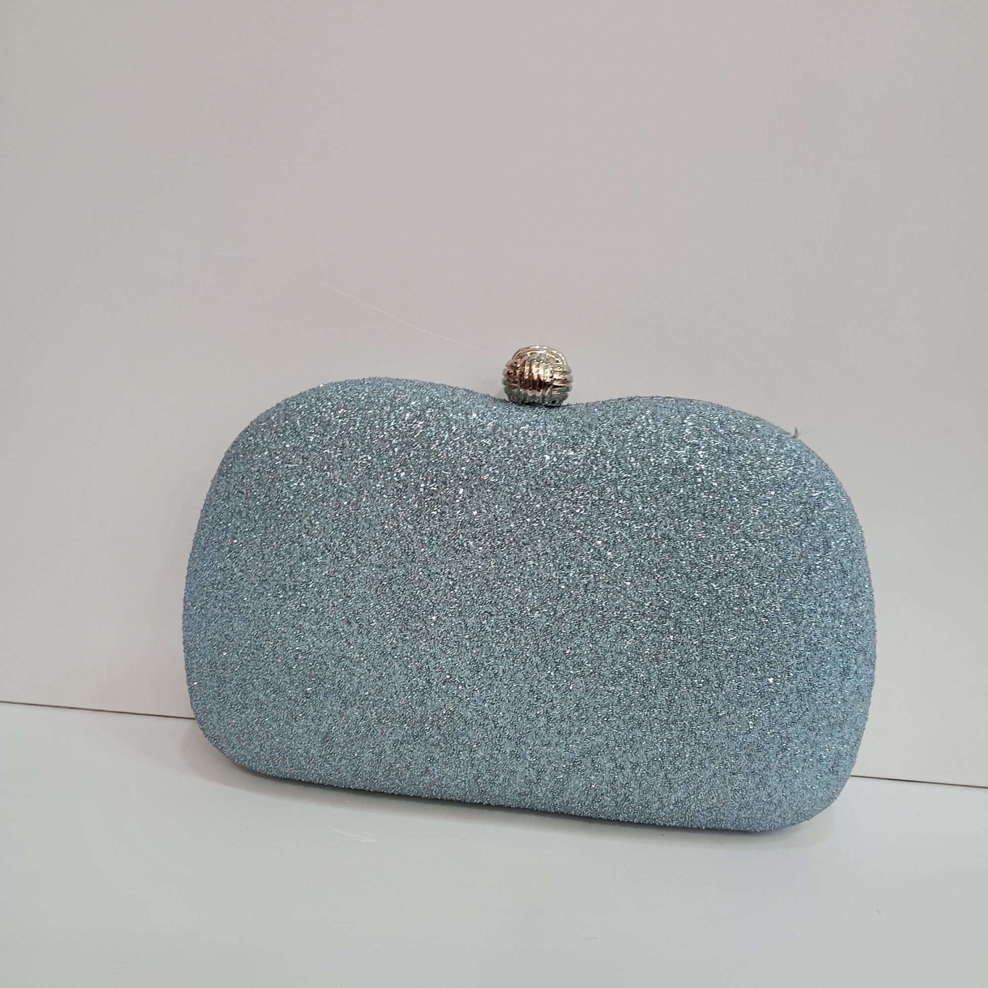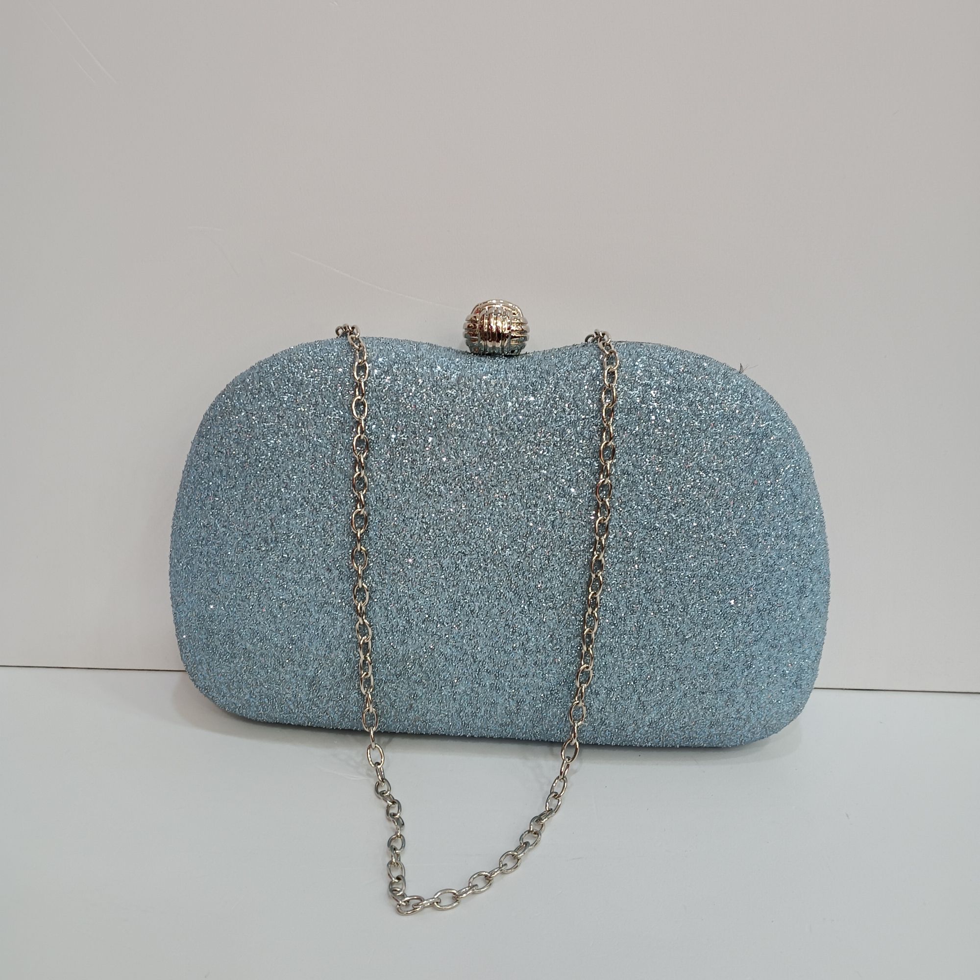 Bolso azul de boda con brillos rugoso . Cierre redondo plateado, cadena larga para poner en el hombro en el interior.
