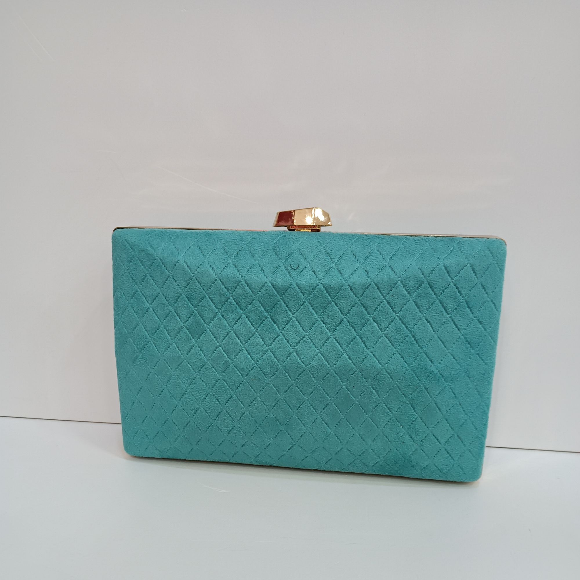 Bolso de boda verde de antelina con dibujos en forma de rombo por las dos caras . Cierre y broche dorada en el interior.