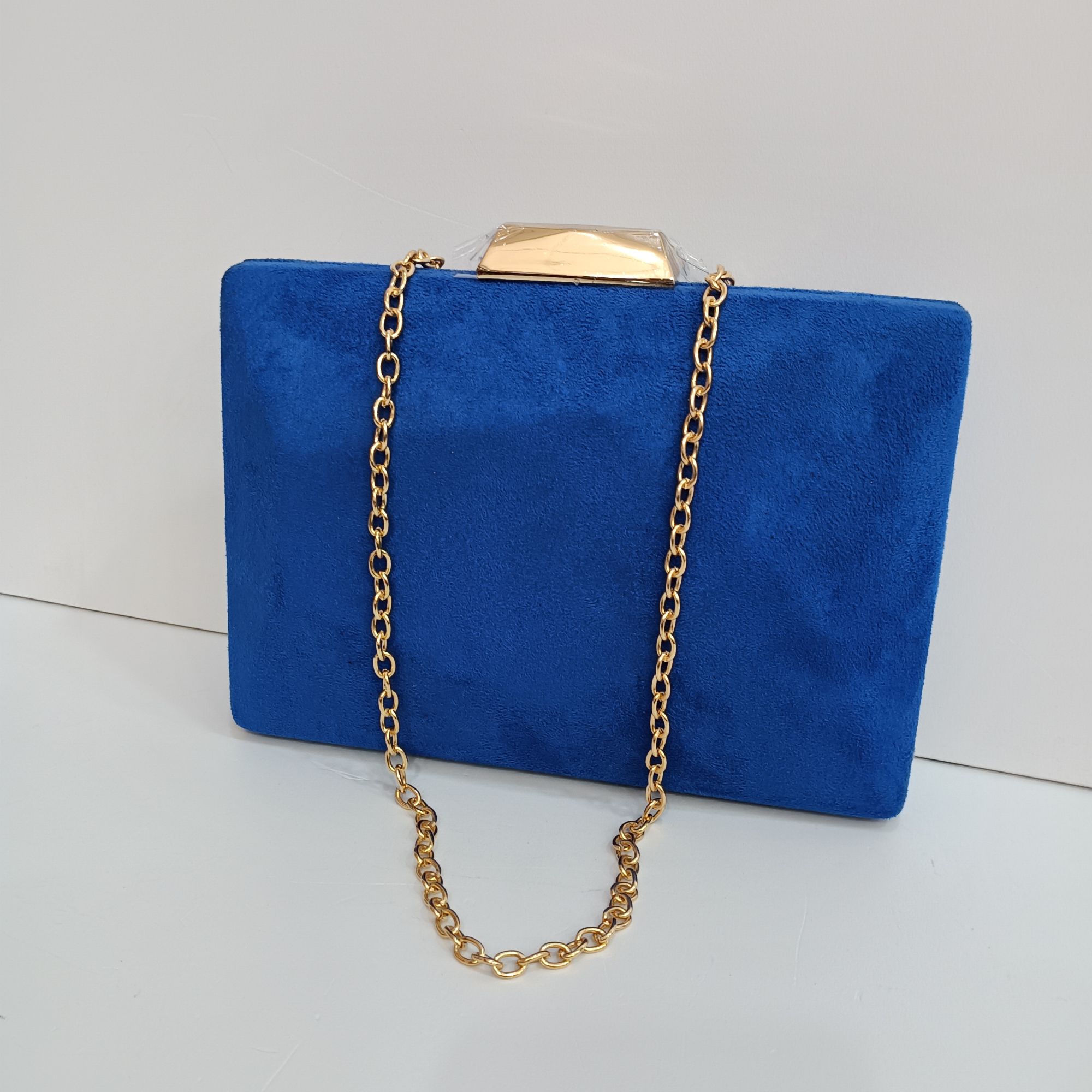Bolso azulon de boda de antelina con dibujos romboides por las dos caras. Cierre y cadena larga para poner en el hombro dorada.