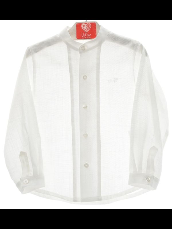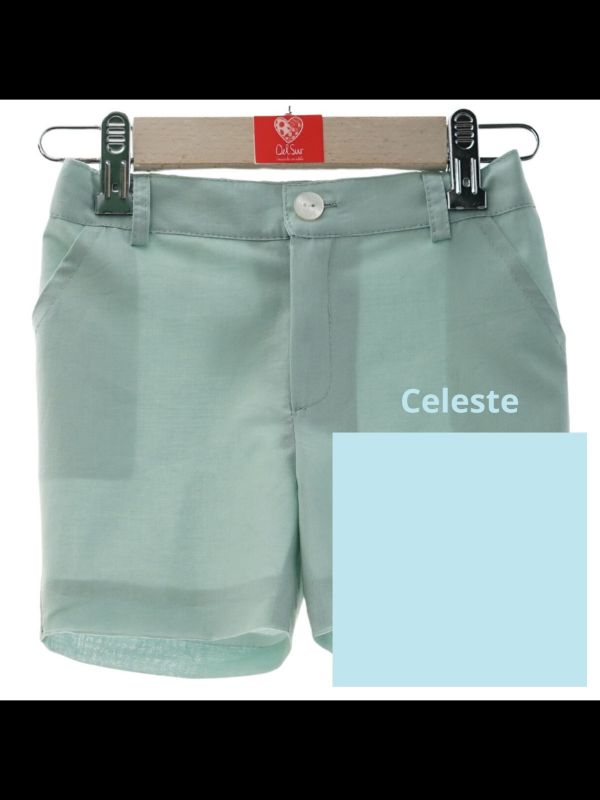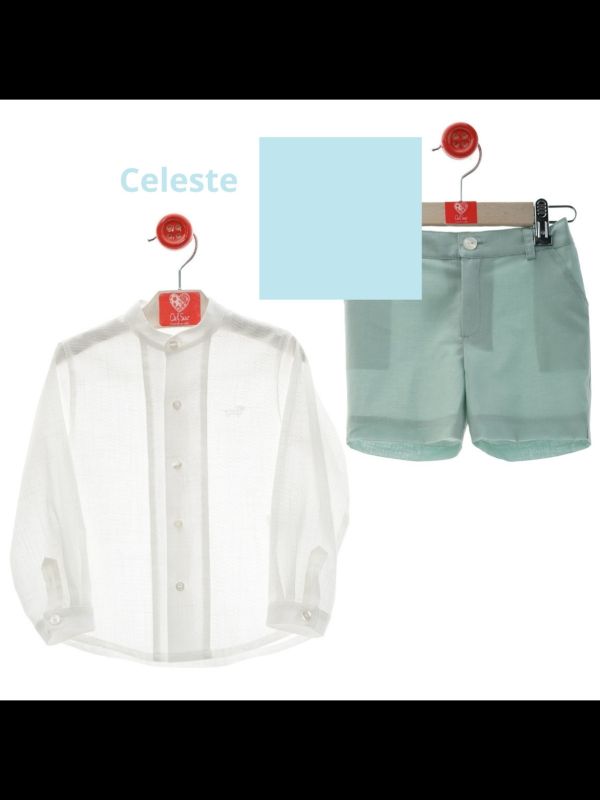 Conjunto niño compuesto por camisa manga larga en blanco y pantalón corto en celeste.