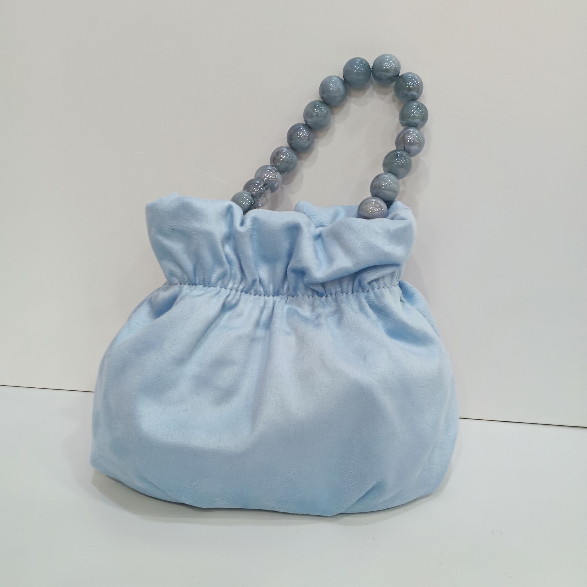 Bolso de antelina en azul , bombonera con cierre elastico . Cadena dorada larga en el interior , asa de mano con bolas .
