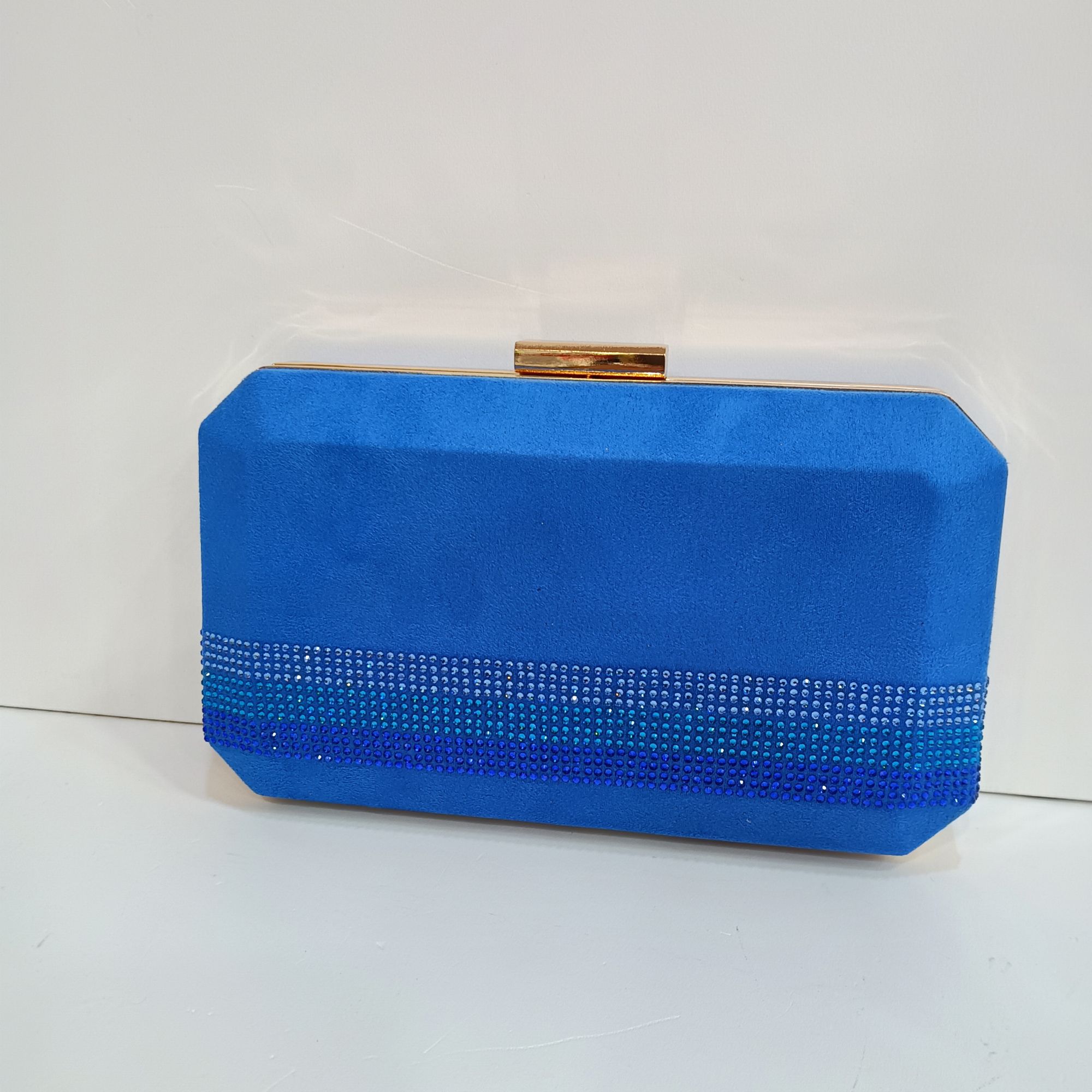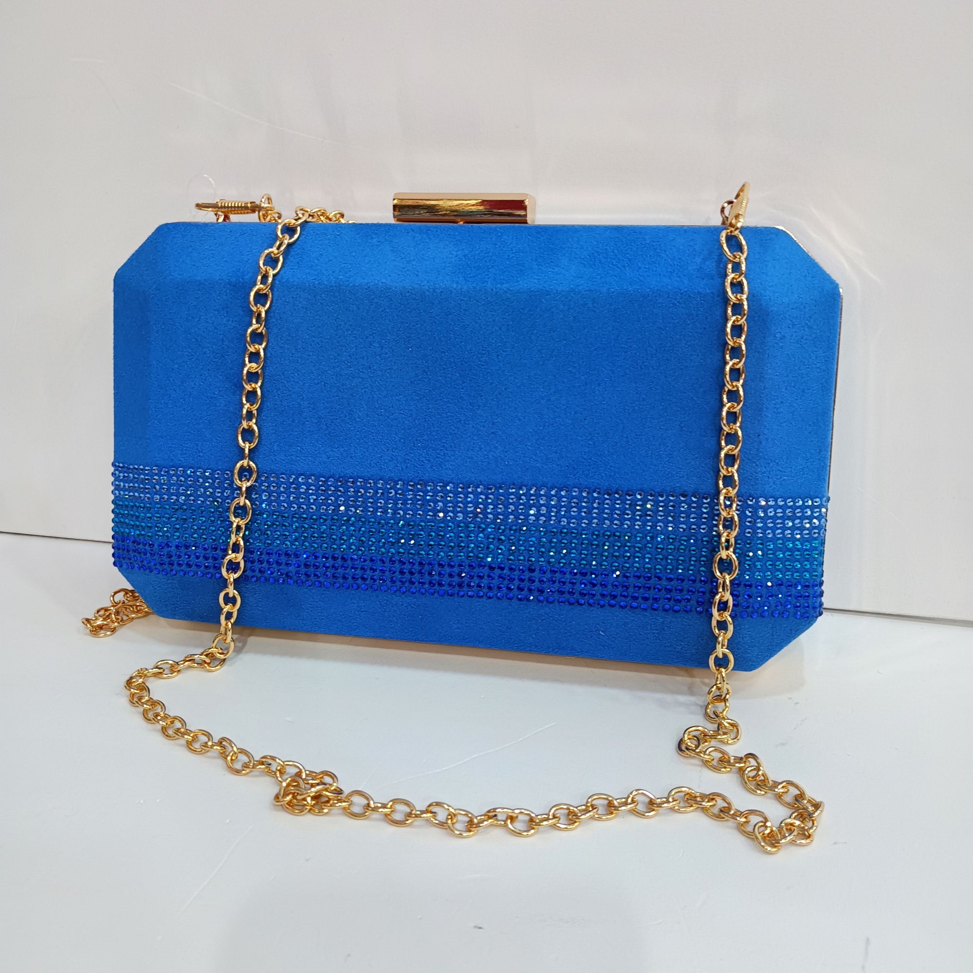 Bolso azulon de antelina con brillantes de distintos colores por las dos caras . Cierre y cadena para el hombro en dorado.