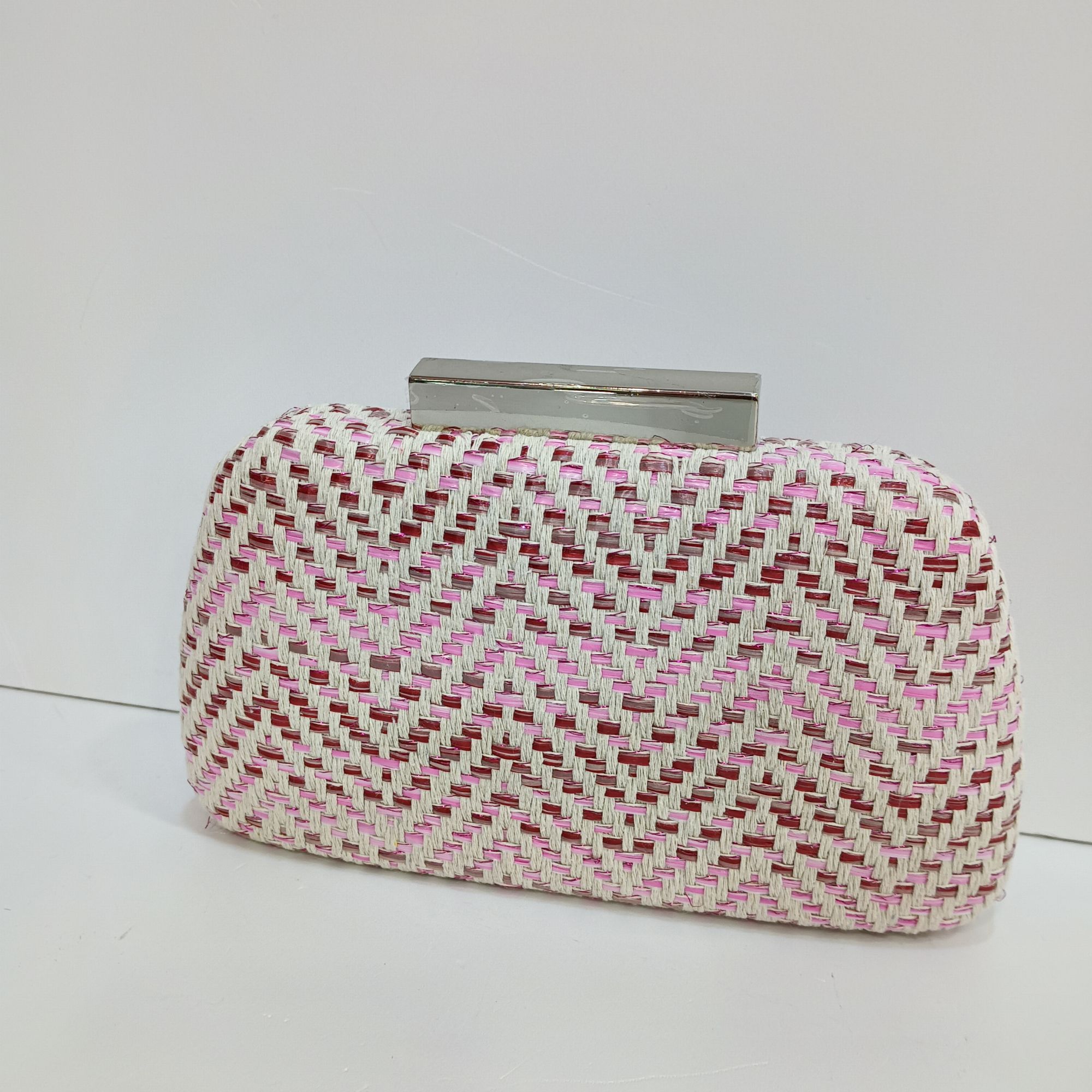 Bolso de paja con tonos rosa , granatesy fondo beige en zizas. Cierre y cadena larga en plata.