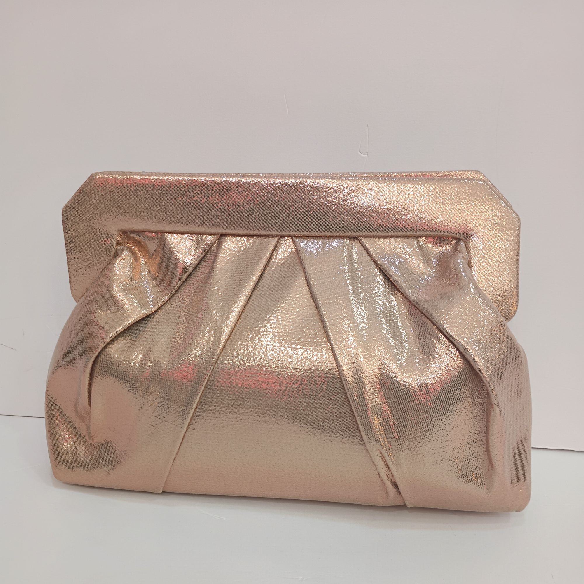 Bolso oro-rosado de tela brillante con pliegue por los dos lados . Cierre de iman y cadena dorada para el hombro.