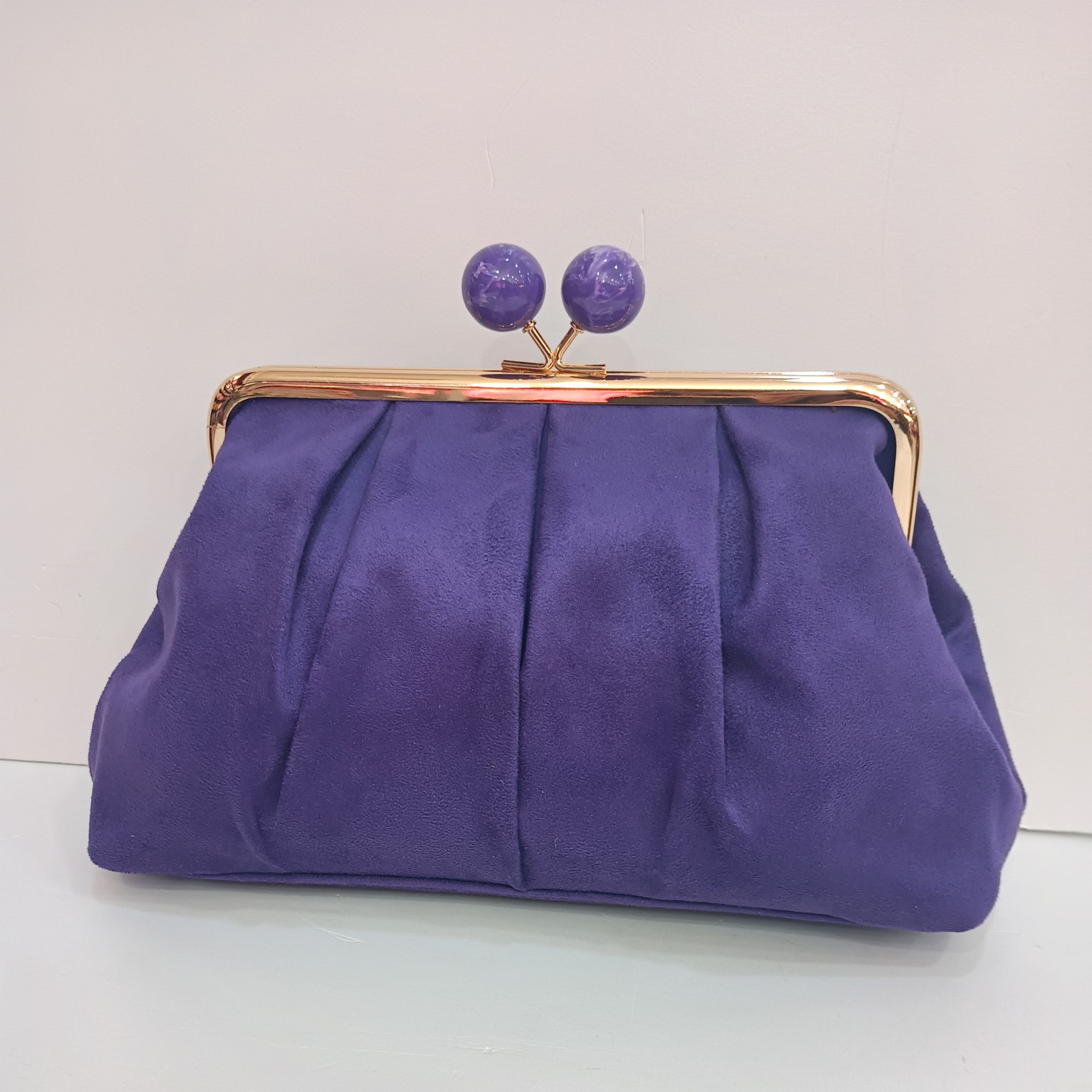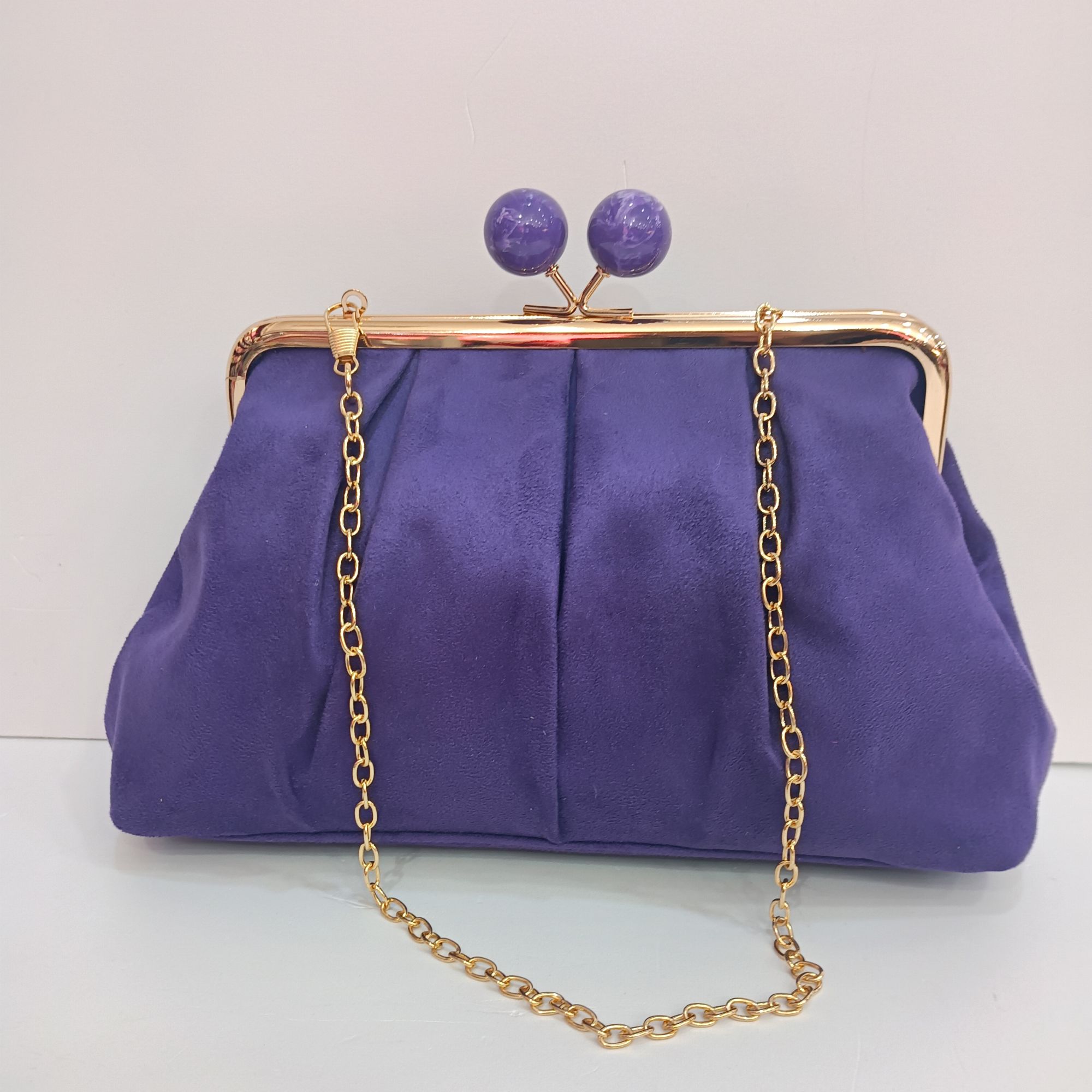 Bolso morado de antelina con cierre de bolas moradas. Cadena larga para el hombro con gran capacidad.