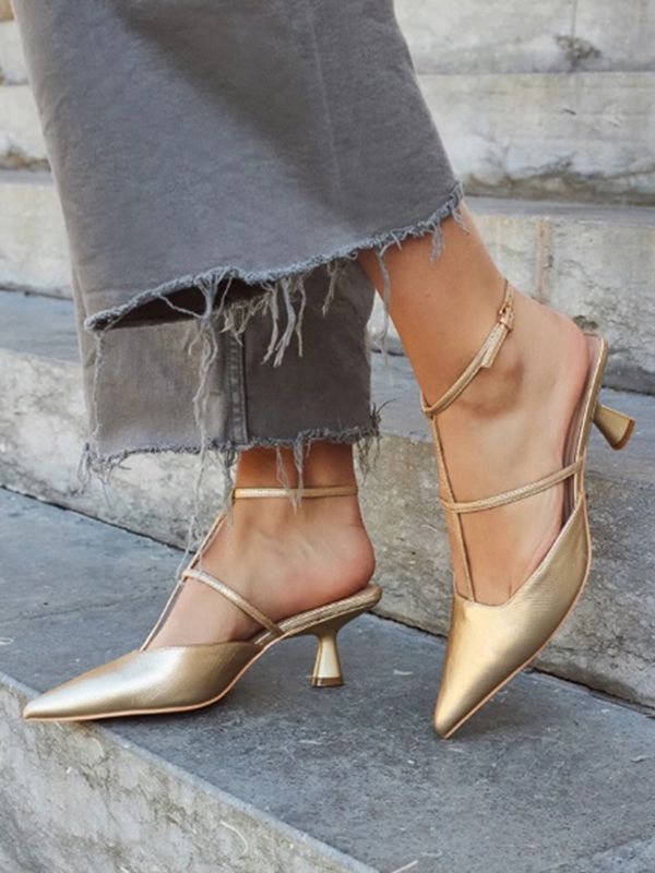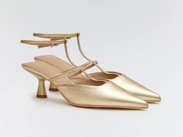 Zapatos de punta destalonado en color oro con tiras al tobillo en el mismo material. Tacón trompeta y plantilla almohadillada.