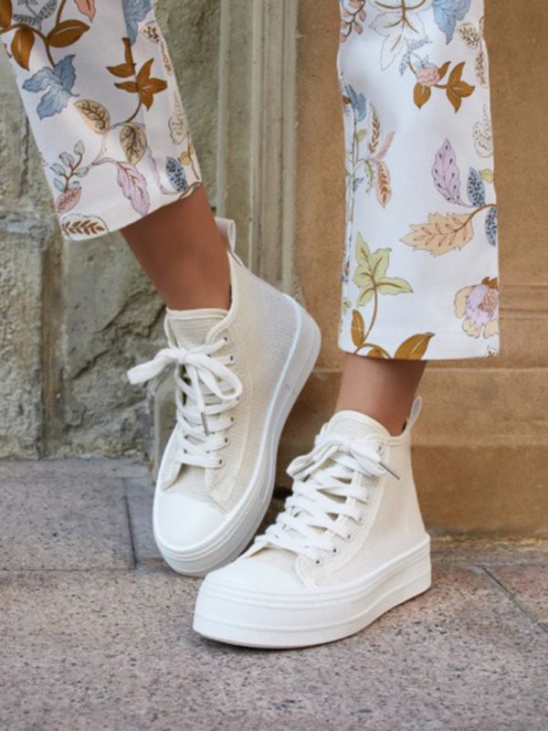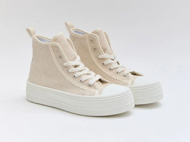 Deportivo tipo botín con tejido en rafia beige y suela con plataforma en blanco.