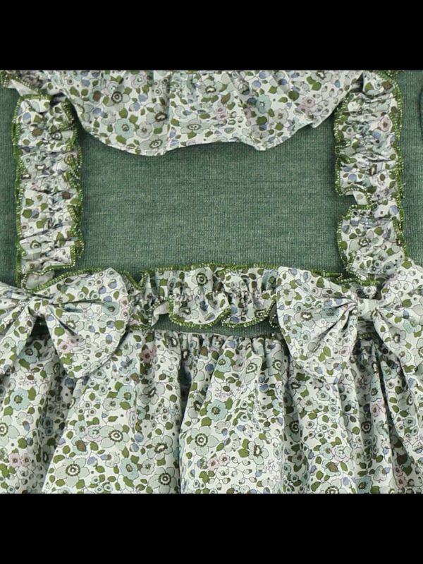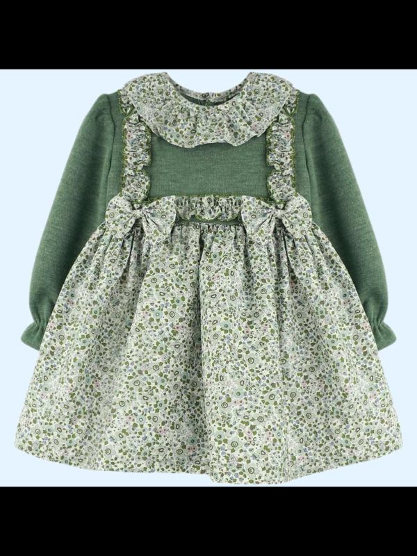 Este vestdo combina dulzura y frescura en un diseño encantador ideal para otoño/invierno. Presenta un delicado estampado floral en la falda, con pequeñas flores en tonos suaves que aportan un aire romántico y natural. El cuerpo del vestido, en un bonito tono verde jardín, contrasta armoniosamente con la falda, creando un conjunto equilibrado y lleno de encanto.