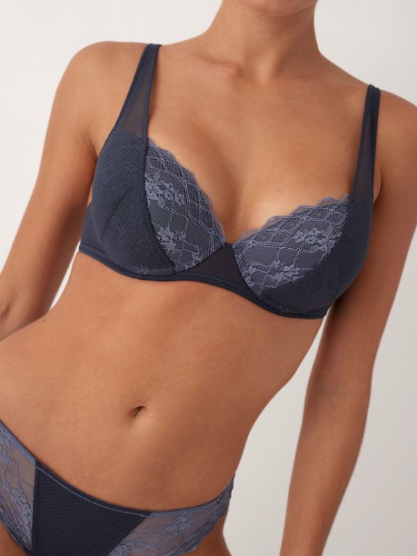 Este conjunto de lencería en azul opera es el complemento perfecto para sentirte sexy y segura. El sujetador push up realza tu escote, mientras que la brasileña resalta tus curvas. Confeccionado con materiales de alta calidad, este conjunto es ideal para lucir a la moda y sentirte cómoda a la vez. ¡Hazte con él y eleva tu estilo!