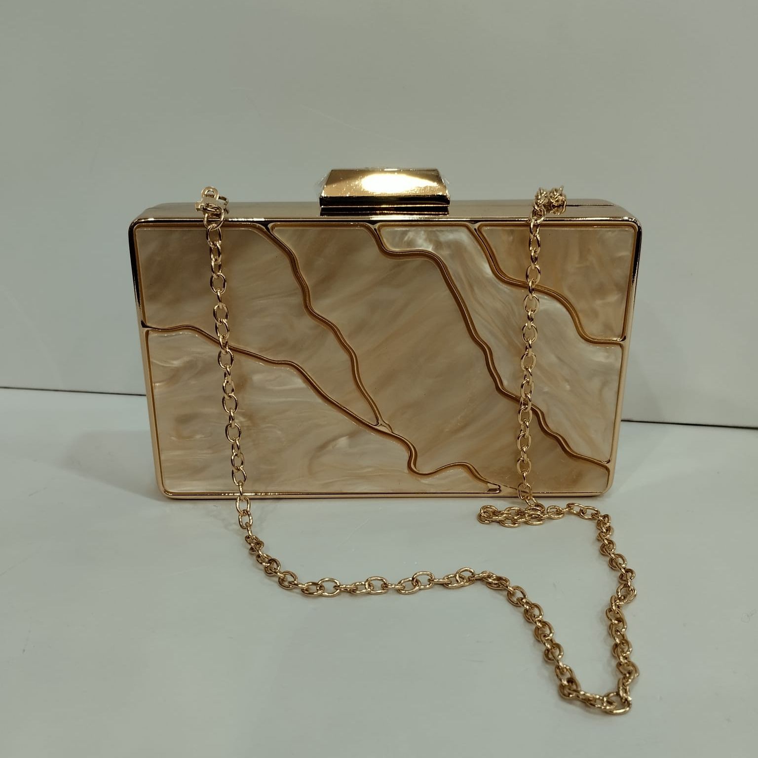 Bolso dorado de nacar con ondas en dorado por las do caras.Cierre y cadena dorada para llevar colgado.Un complemento perfecto para elevar tu look de invitada.