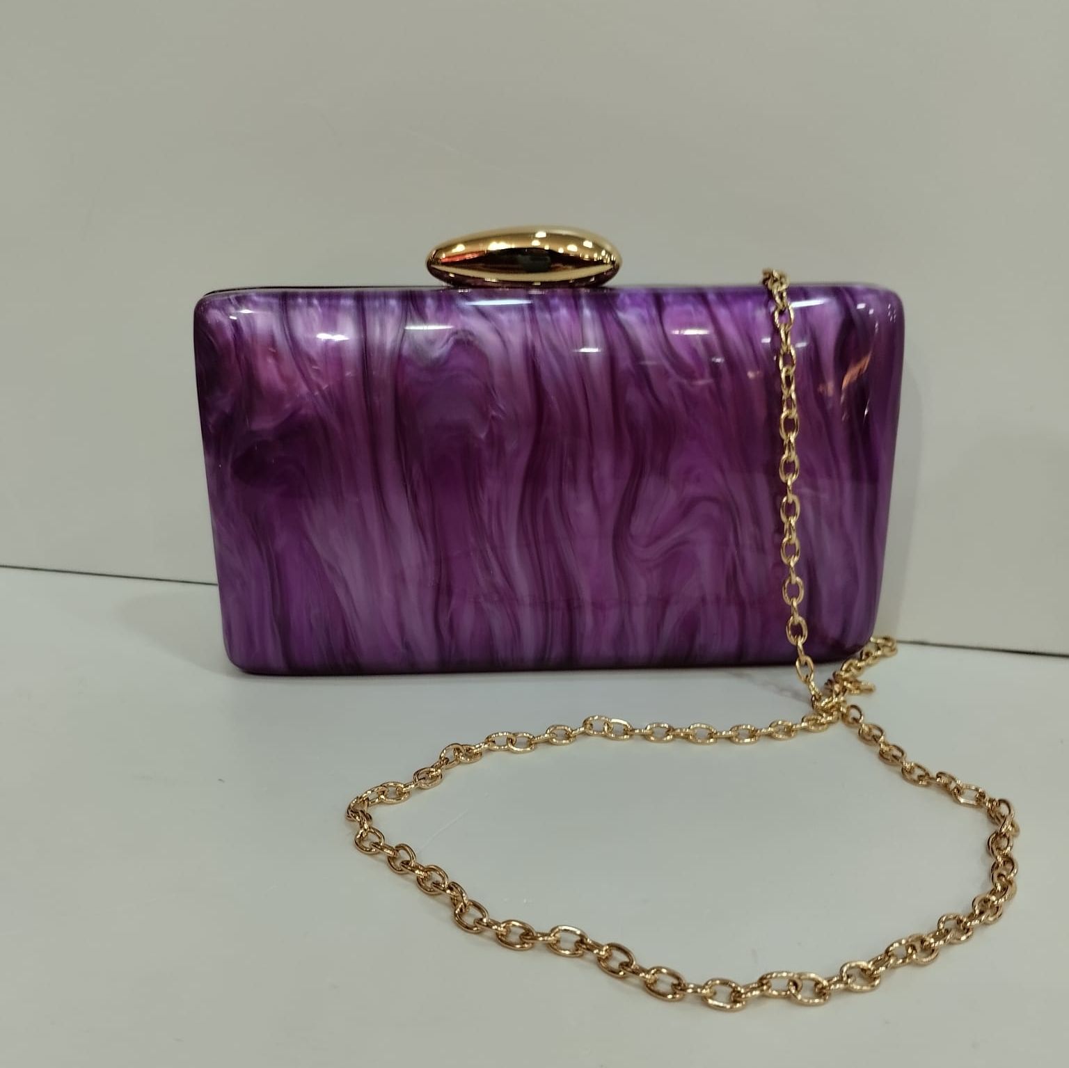 Bolso rectangular de nacar en morado haciendo aguas en distintos tonos. Broche ovalado en dorado y cadena para colgarlo al hombro para eventos de dia y noche.