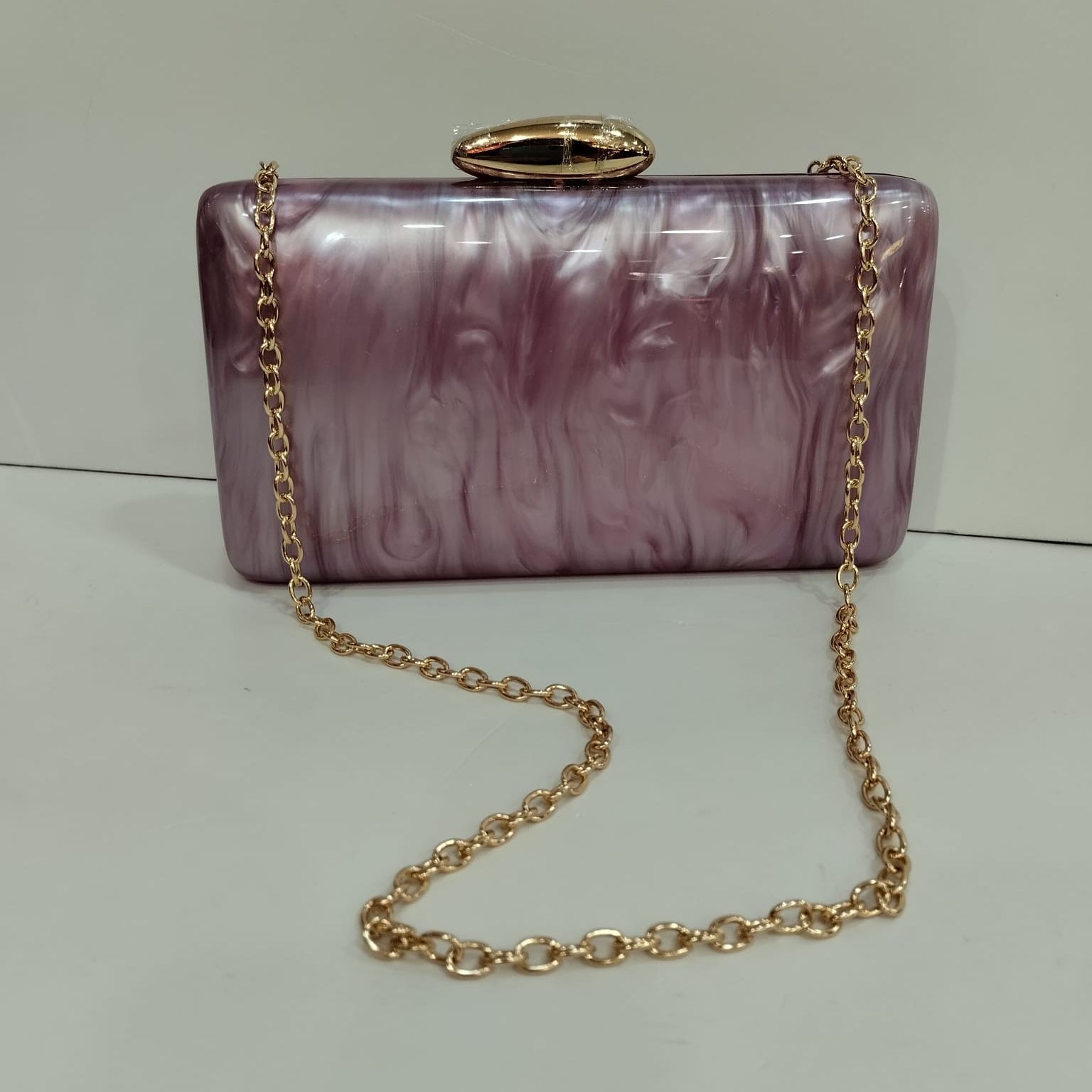 Bolso rosa de nacar con ondas en dorado por las do caras.Cierre y cadena dorada para llevar colgado.Un complemento perfecto para elevar tu look de invitada.