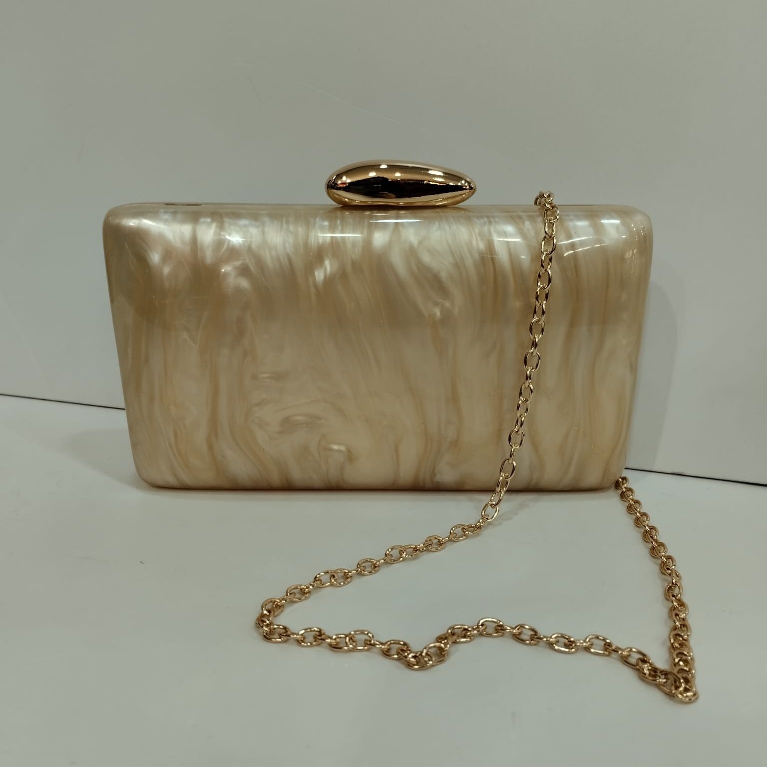 Bolso dorado de nacar con ondas en dorado por las do caras.Cierre y cadena dorada para llevar colgado.Un complemento perfecto para elevar tu look de invitada.