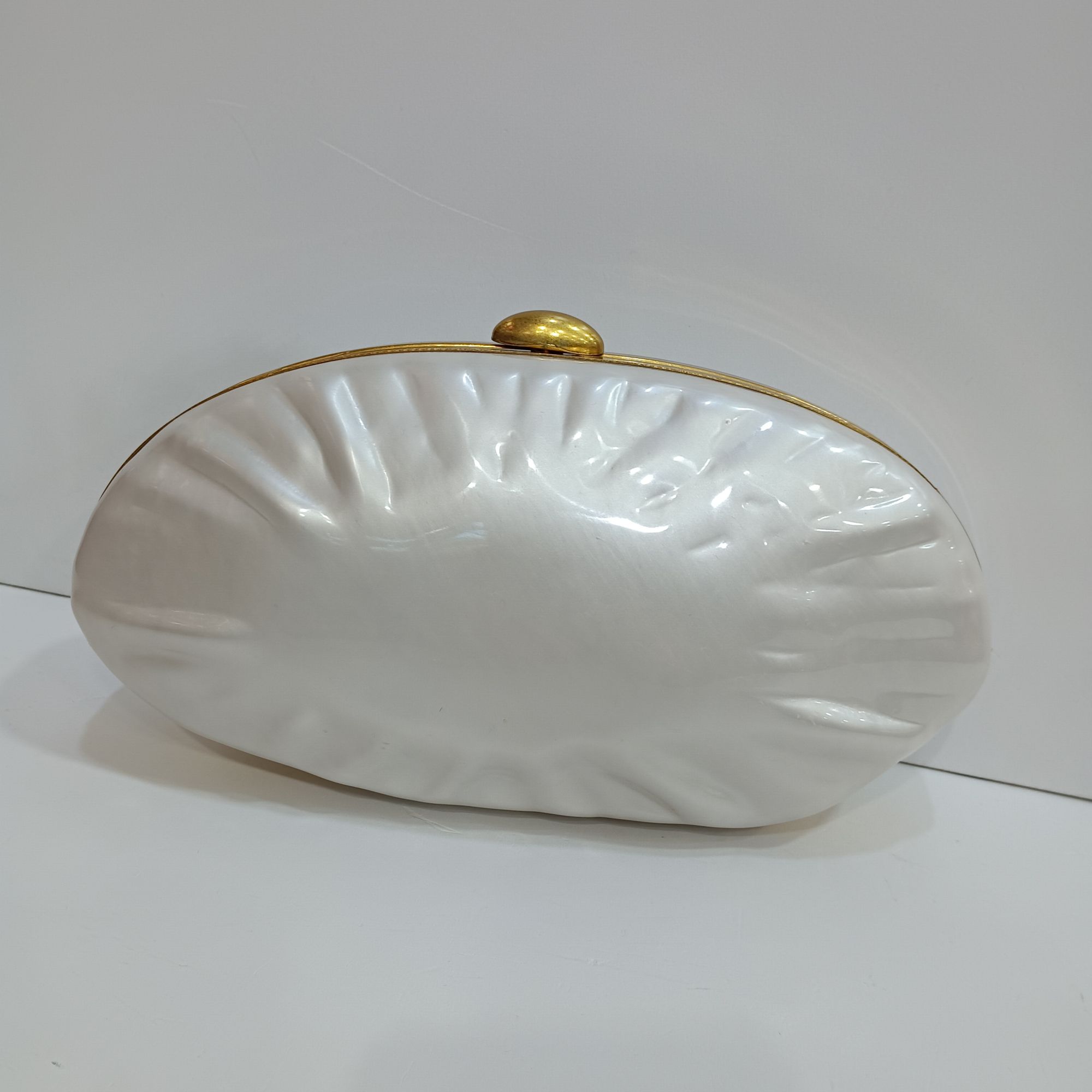 Bolso blanco de nacar con ondas por los dos lados , cierre alrededor dorado y cadena larga para el hombro.