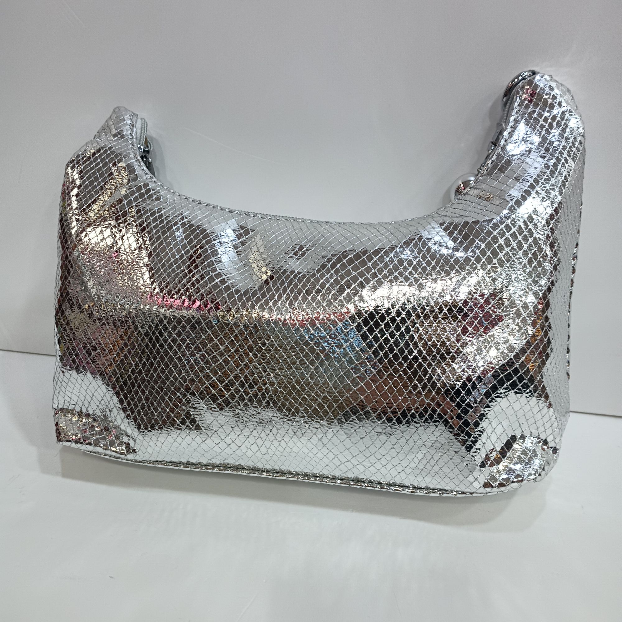 Bolso plata de polipiel , asa de bolas y cadena dorada larga para colgar en el hombro. De gran capacidad ideal para todos tus eventos.