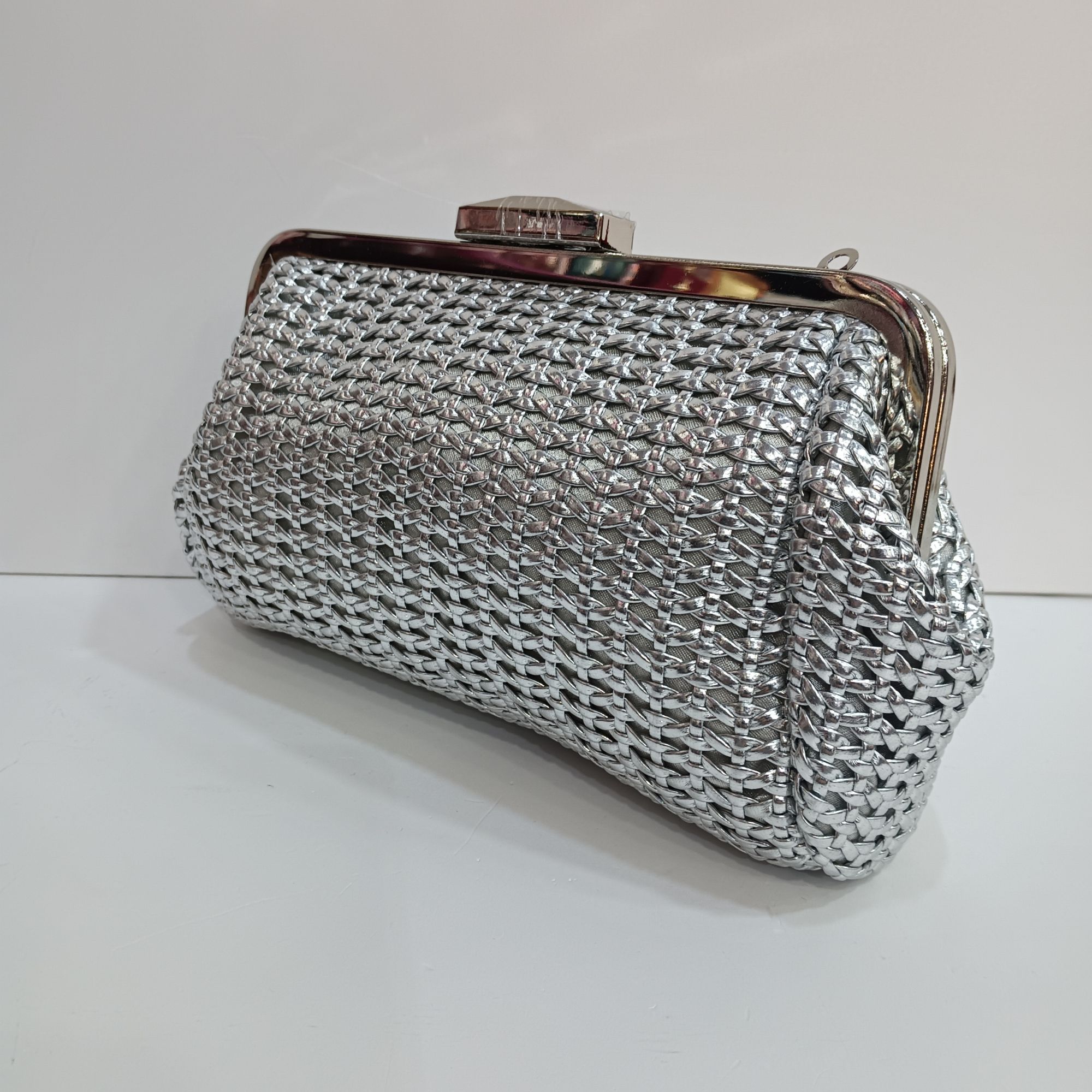 Bolso plateado en forma de bague con piel de rejilla trenzada .Cadena plateada larga `para colgar en el hombro. Con gran capacidad