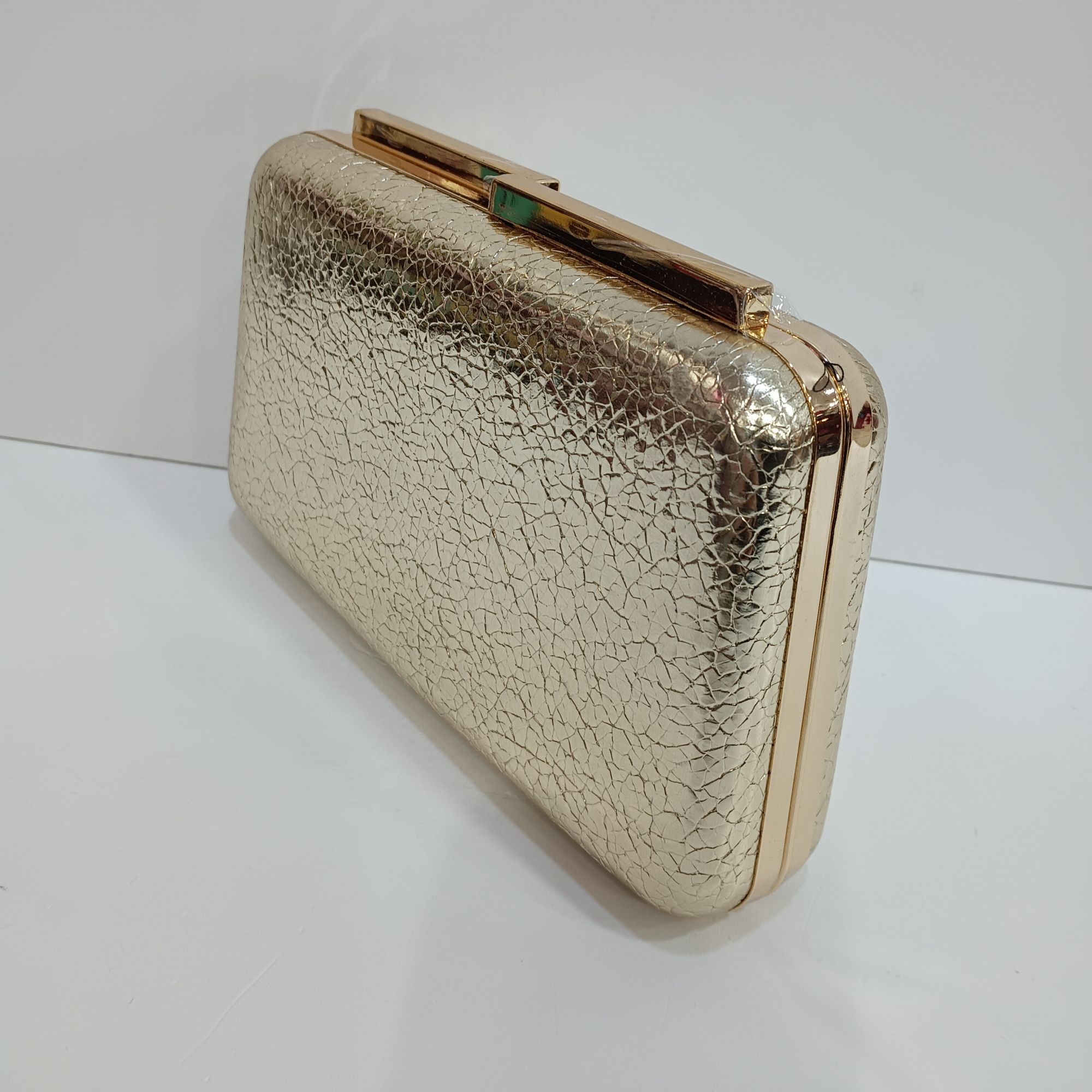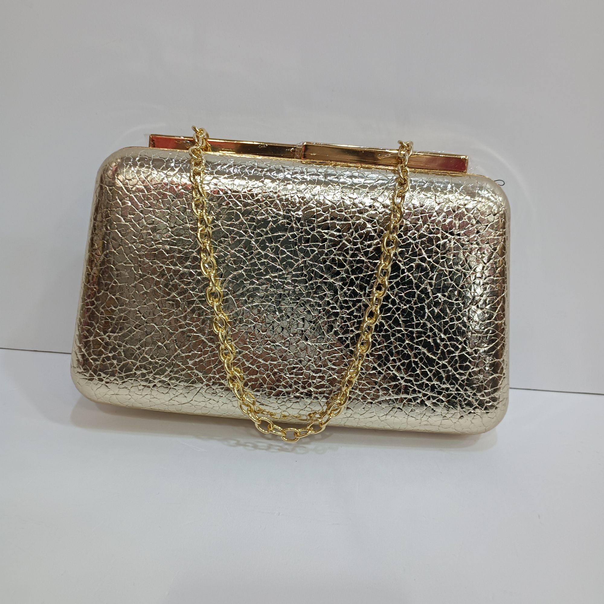Bolso dorado con dibujos cuarteados por las dos caras , cierre alargado. Cadena dorada larga para llevar en el hombro ideal para tus eventos.
