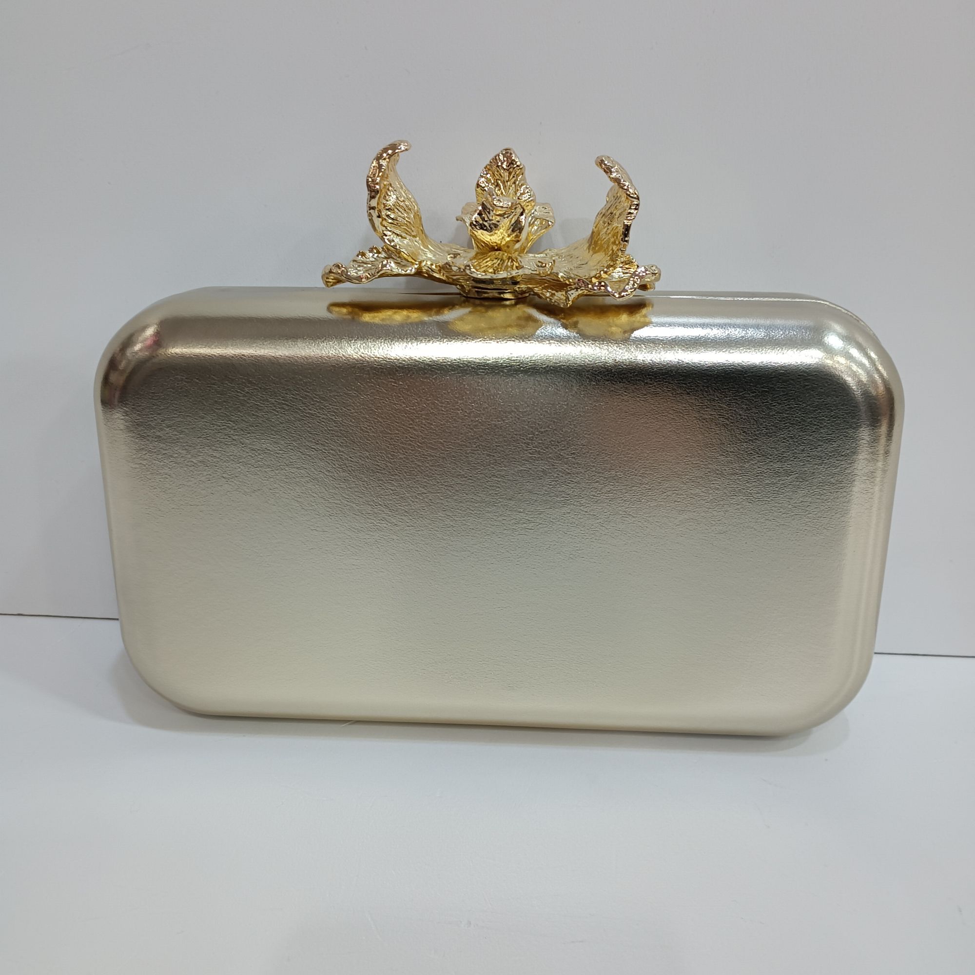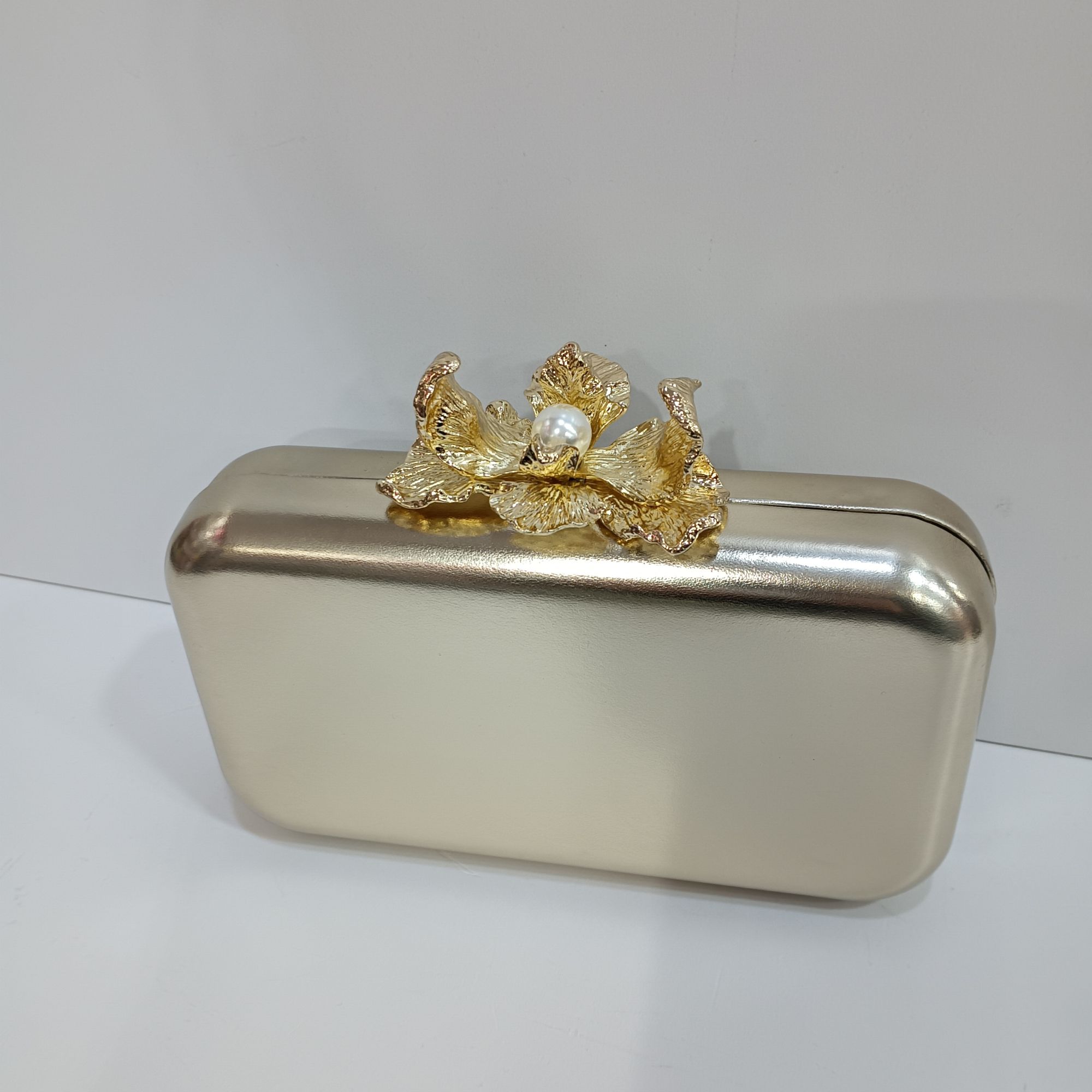Bolso dorado metalizado con una espectacular flor metàlica dorada de broche y una perla en el centro. Cadena dorada larga para colgar al hombro ideal para tus eventos.