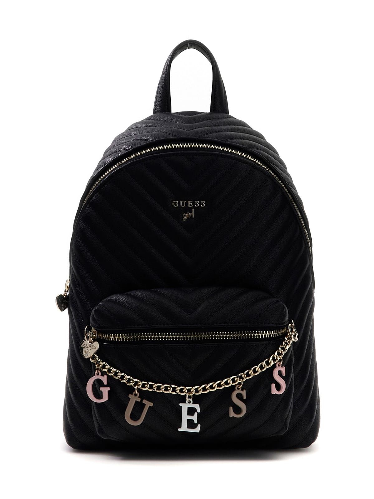 Mochila pequeña con costuras en V, contiene dos bolsillos una cadena dorada con letras de GUESS.