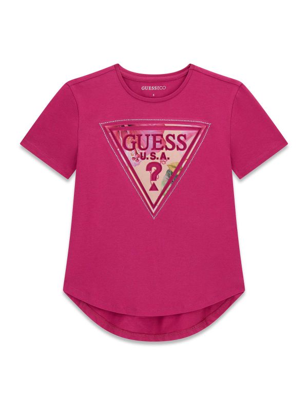 Camiseta manga corta de mujer, logo de Guess con profundidad en las letras y borde perlado