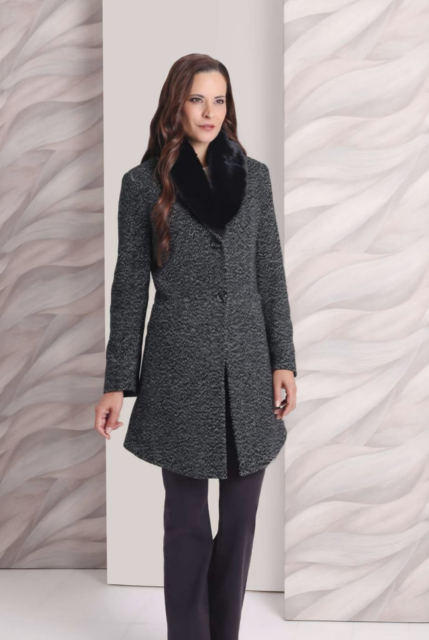 Elegancia clásica para los días más fríos. Este abrigo de corte estructurado presenta un tejido jaspeado en tonos grises que aporta textura y distinción. El detalle estrella es su cuello de piel sintética desmontable en color negro, que añade un toque de lujo y calidez extra. Ideal para looks de oficina o eventos formales.
