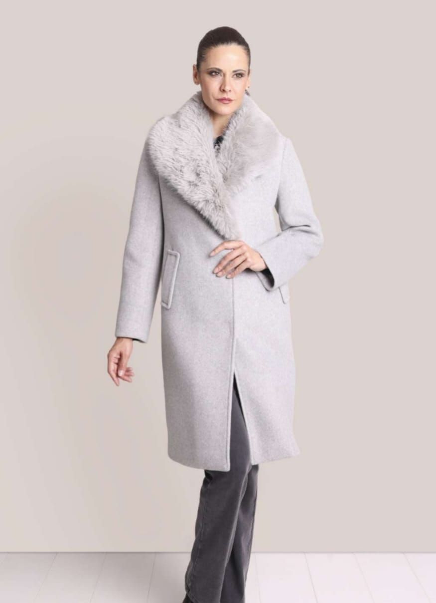 Una pieza de alta sofisticación que combina un diseño de líneas limpias en color gris perla con un exclusivo cuello envolvente de pelo sintético a tono. Confeccionado en un tejido de tacto suave y gran calidez, su corte recto estiliza la figura sin esfuerzo. Es la prenda definitiva para aportar luz y elegancia a cualquier look de invierno, desde la oficina hasta una cena especial.