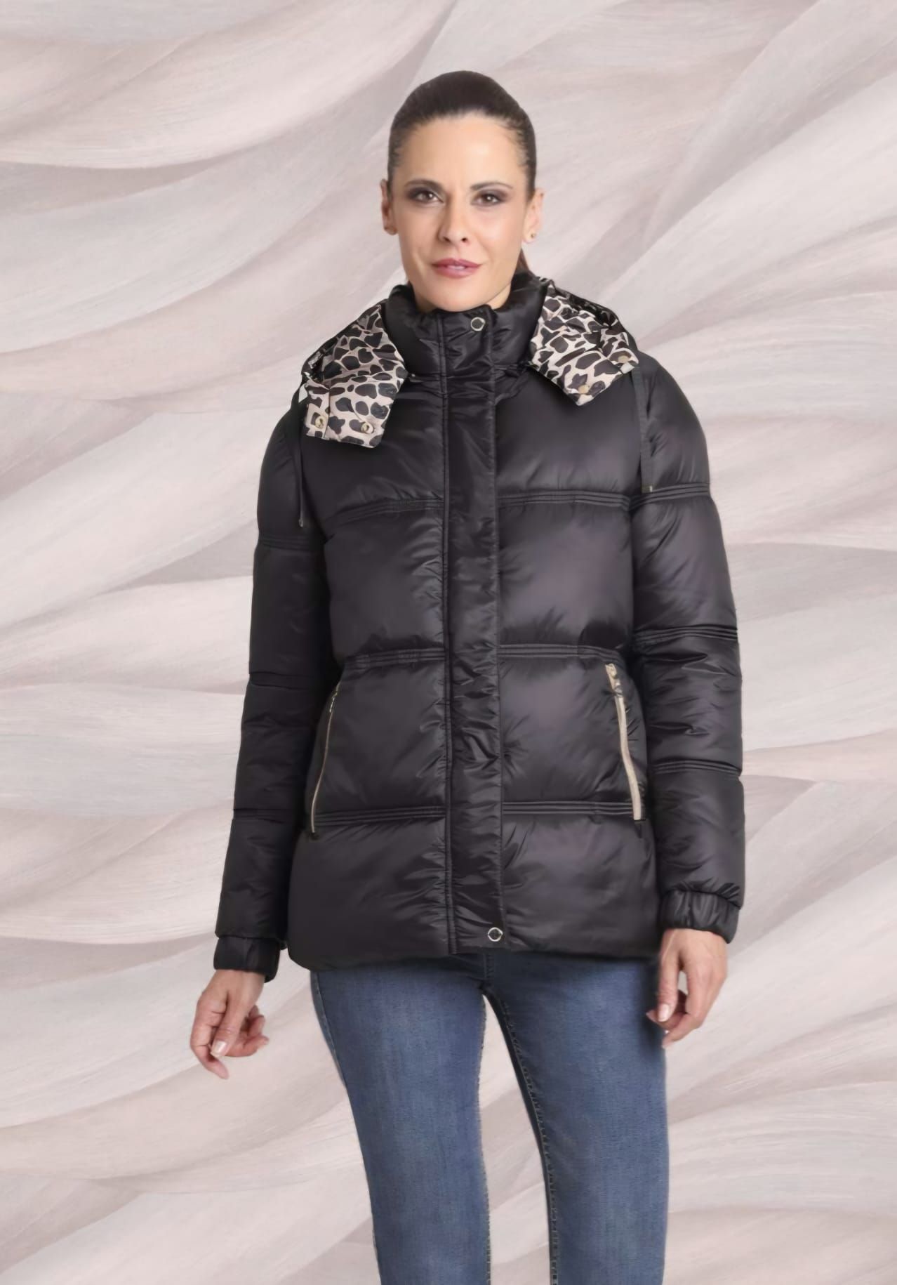 Un básico imprescindible con un giro atrevido. Este plumífero negro de acabado satinado destaca por su capucha con forro de leopardo, aportando un toque de tendencia a un diseño clásico. Cuenta con un acolchado horizontal que garantiza calidez, bolsillos con cremalleras doradas y un cierre frontal oculto para un acabado limpio y elegante.