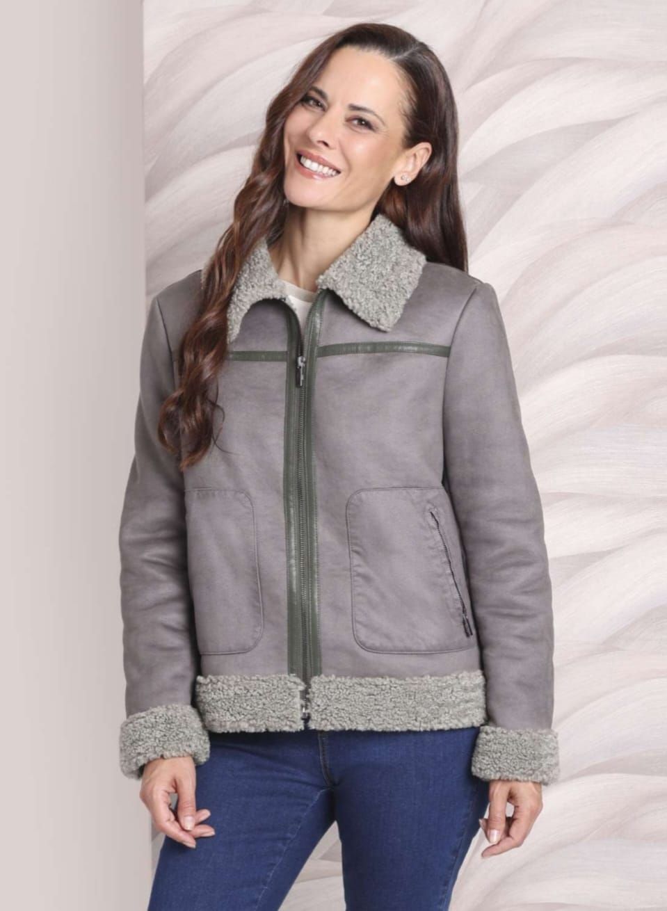 Esta cazadora estilo aviador destaca por su versatilidad y calidez. Presenta un sofisticado color verde musgo que se integra perfectamente con las tendencias de esta temporada. Su interior, totalmente forrado de suave borrego sintético en un tono gris perla en contraste, te ofrece una barrera inmejorable contra el frío, además de un tacto muy agradable.