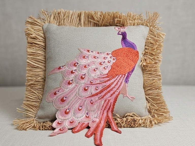 Una pieza artística que presenta un majestuoso pavo real bordado con hilos de seda en tonos rosados y violetas. Enmarcado con flecos naturales que realzan su estilo bohemio-chic.