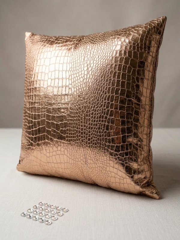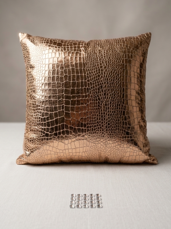 Una pieza versátil con doble personalidad. Por un lado, un impactante acabado metalizado con textura de escamas en oro rosa; por el otro, un suave terciopelo en tono moca para un look más sereno y elegante.