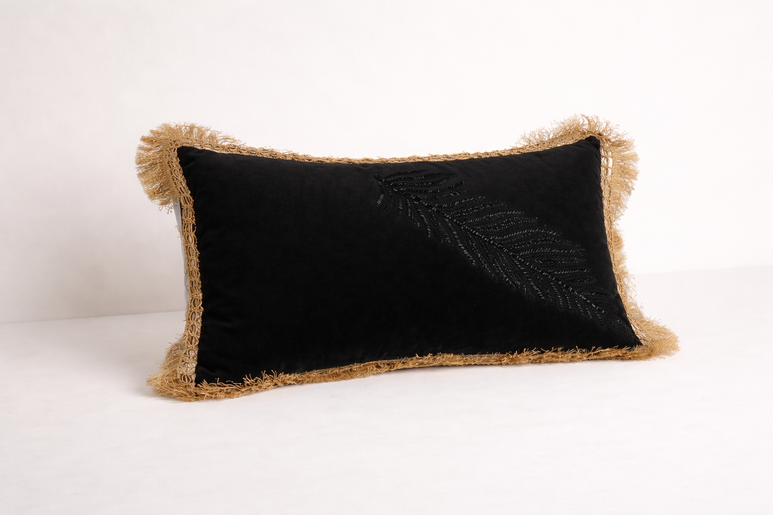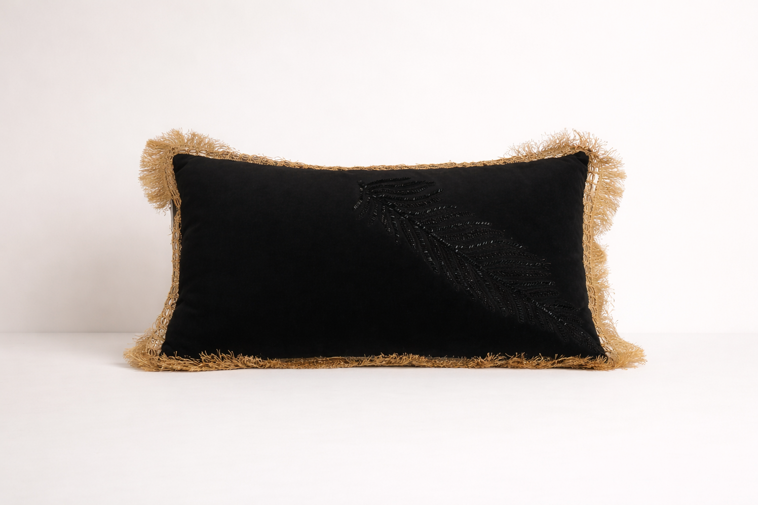 Una pieza de coleccionista. Este cojín destaca por un meticuloso bordado de pluma realizado en micro-pedrería brillante que resalta sobre el fondo liso. Enmarcado por flecos dorados de alta densidad, este diseño evoca el glamour del estilo Art Déco. Disponible en negro profundo para un contraste dramático o en blanco alba para un lujo radiante.