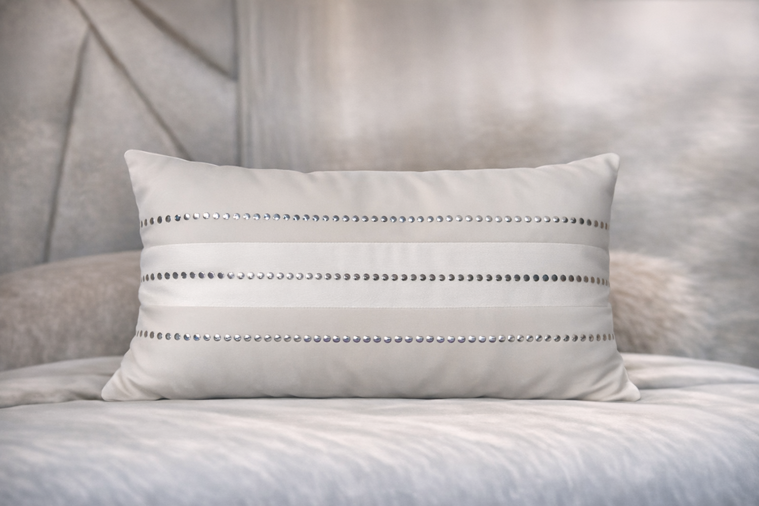 Cojín rectangular en tono claro, decorado con cinco líneas horizontales de tachuelas metálicas que aportan brillo y sofisticación. Ideal para añadir un toque elegante y contemporáneo a sofás y butacas.