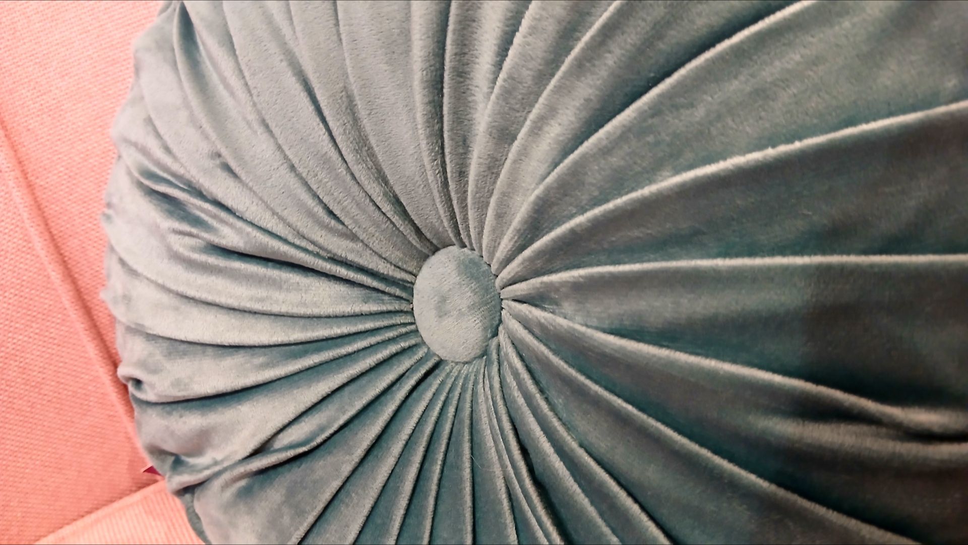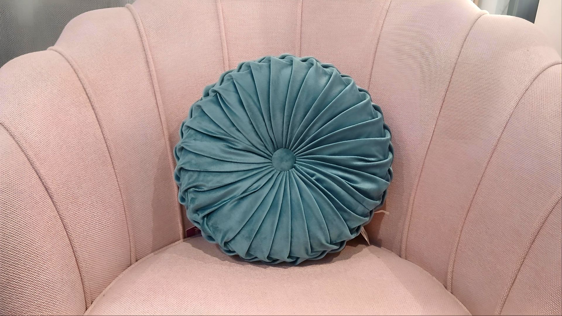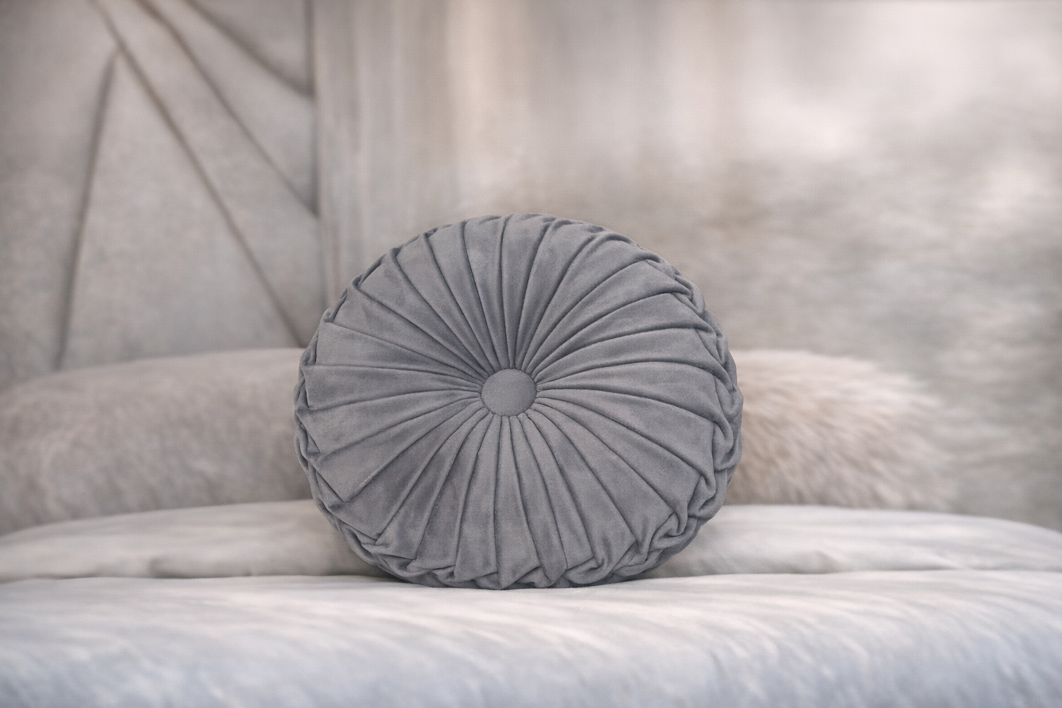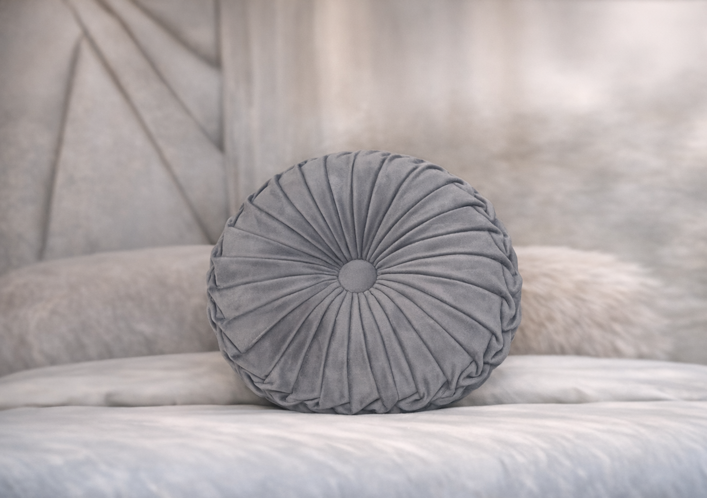 Cojín redondo en tono gris y azul con un elegante diseño plisado que converge en un botón central. Su textura suave y su estilo clásico lo hacen perfecto para aportar volumen y sofisticación a sofás y camas