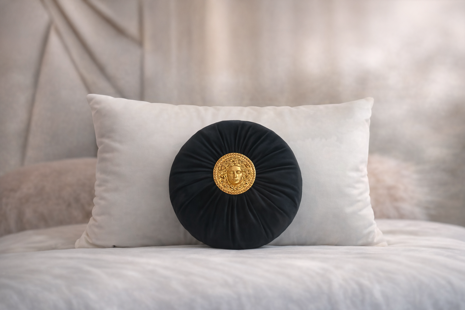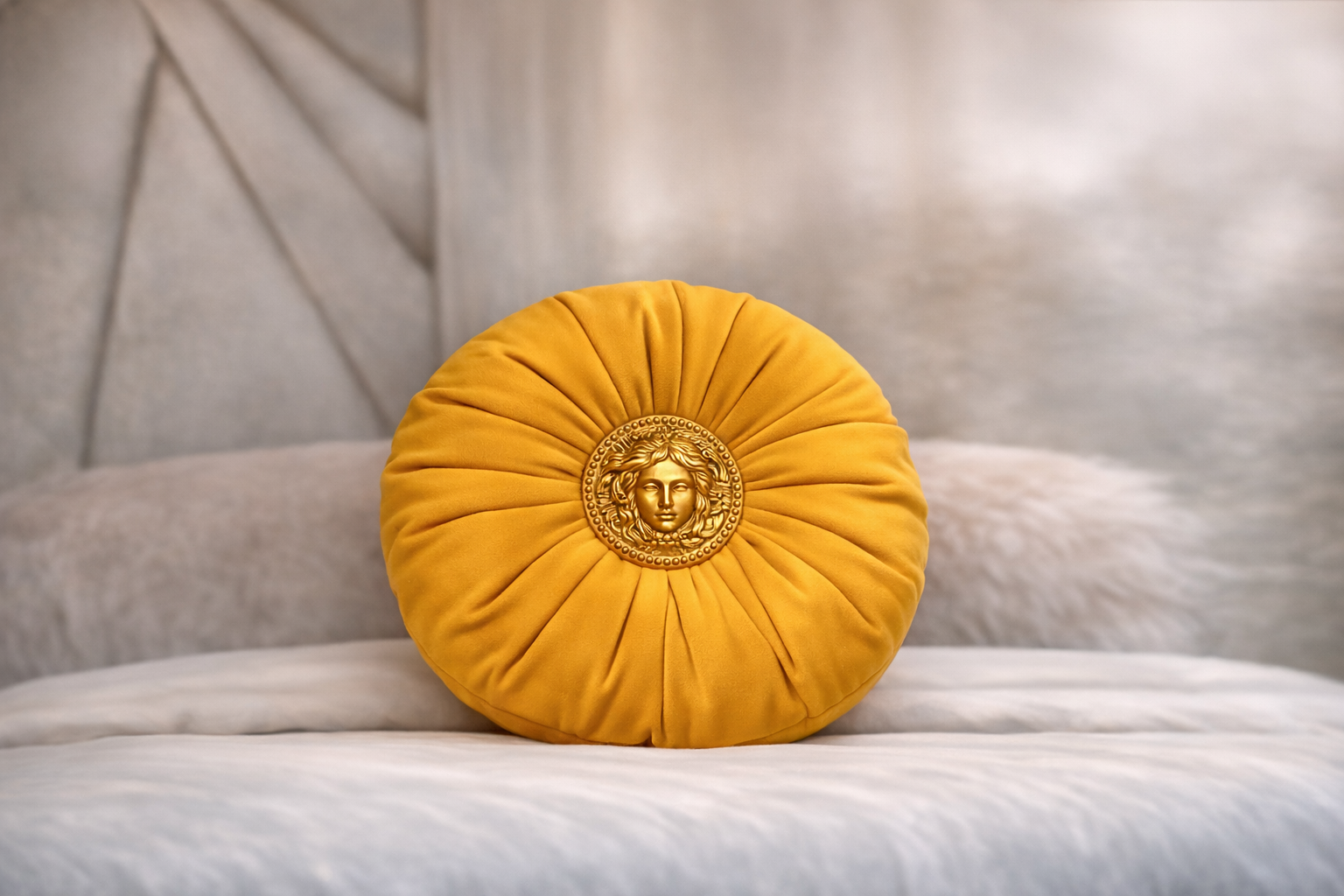 Cojín redondo en color mostaza o negro con un espectacular medallón dorado en el centro y un diseño plisado que realza su forma. Una pieza llamativa y lujosa para ambientes sofisticados.