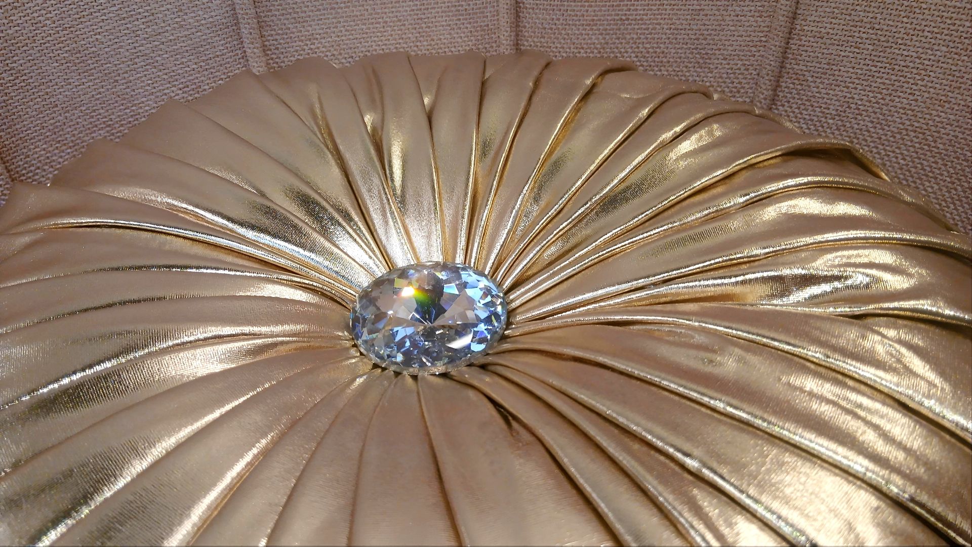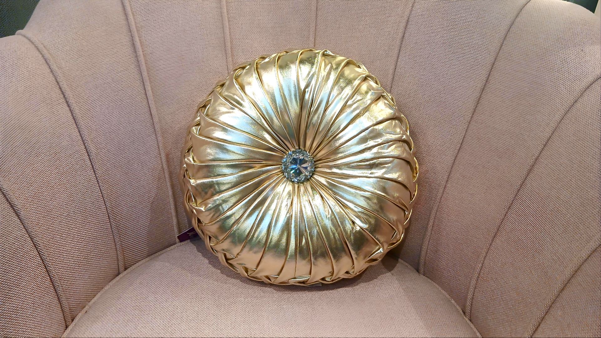 Cojín redondo en acabado dorado metálico con pliegues radiados y botón central tipo joya. Aporta un toque lujoso y elegante a cualquier espacio.