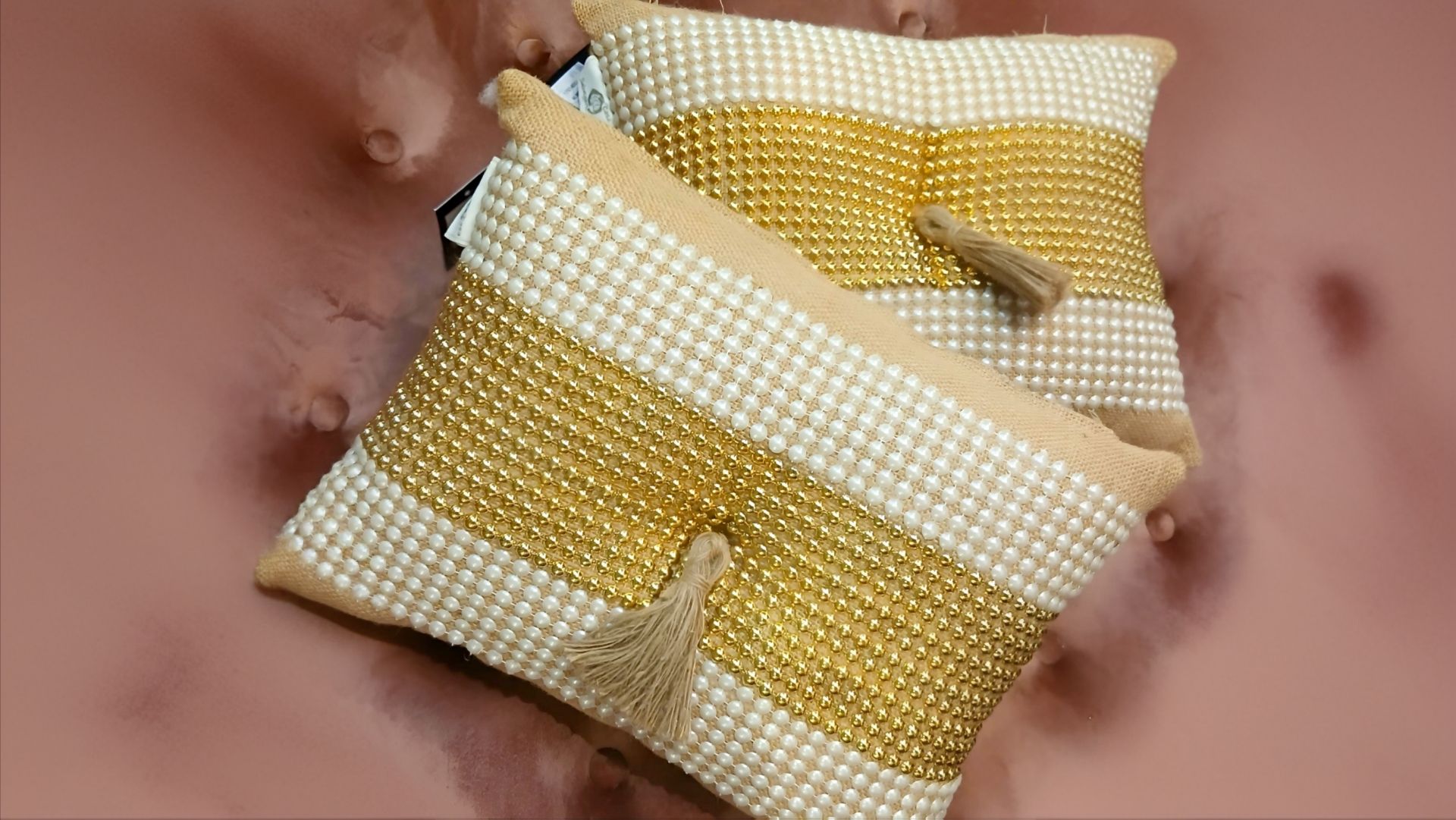 Cojines beige con bandas decorativas de perlas y tachuelas doradas, rematados con un elegante borlón central. Un diseño artesanal y lujoso para espacios refinados.