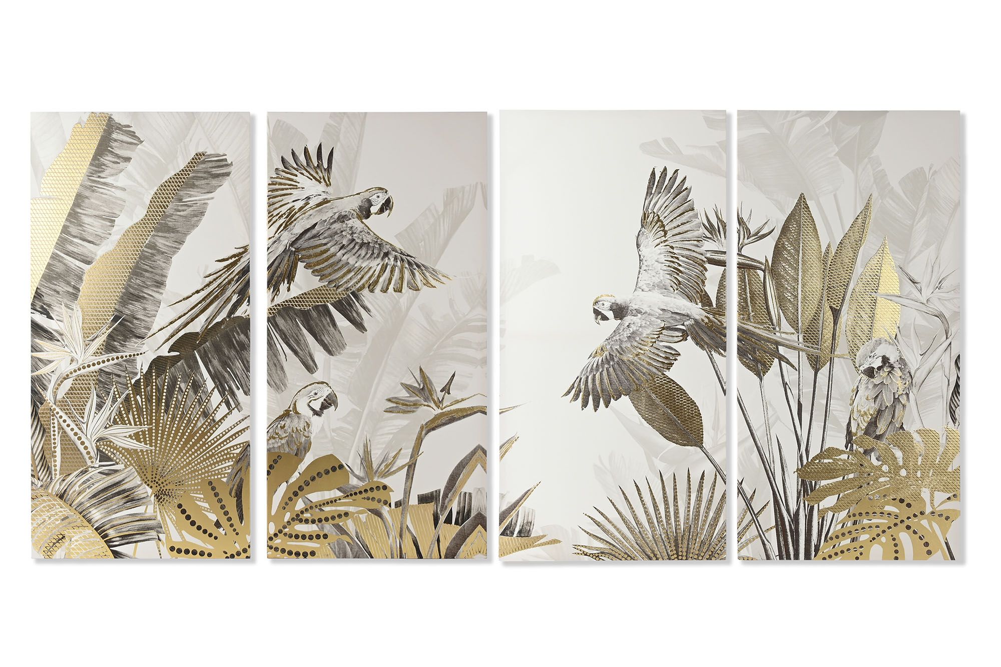 Una composición artística dividida en cuatro paneles que combina hojas exóticas y loros en movimiento, trabajados en una paleta monocromática con acentos dorados. Su estilo sofisticado aporta dinamismo y un toque de lujo a cualquier espacio moderno.