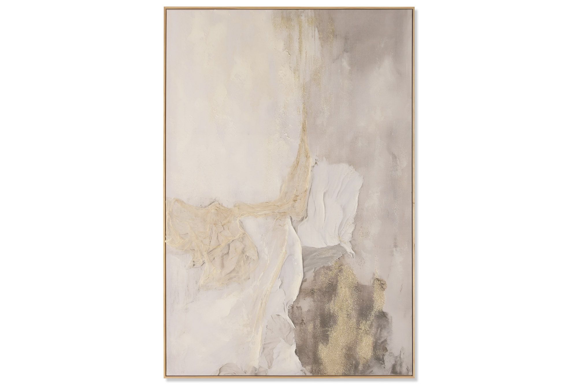 Una obra abstracta de tonos suaves que combina capas texturizadas con delicados acentos dorados. Su estética minimalista y cálida la convierte en una pieza ideal para ambientes modernos y relajados.